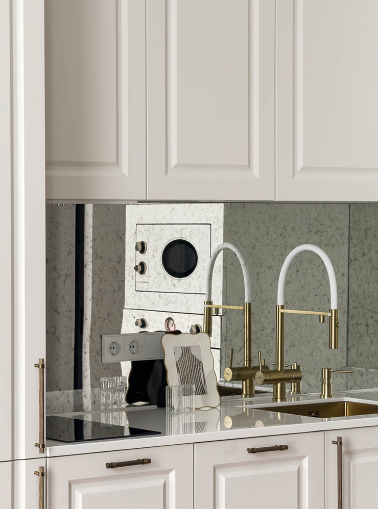 Это могут быть ручки мебели, элементы декора, смесители. Хромированные варианты сделают интерьер более холодным, а теплые оттенки, наоборот, добавят уюта.