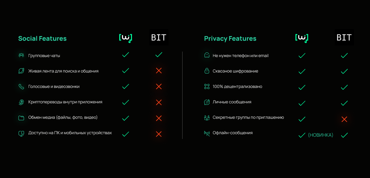 BitChat в основном сосредоточен на офлайне, а WireMin позиционирует себя как полноценную соцсеть — работающую и онлайн, и офлайн, с групповыми пространствами, крипто-переводами и звонками.