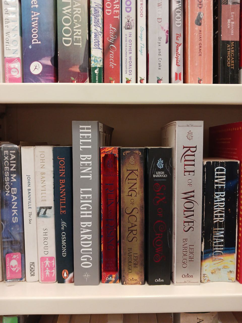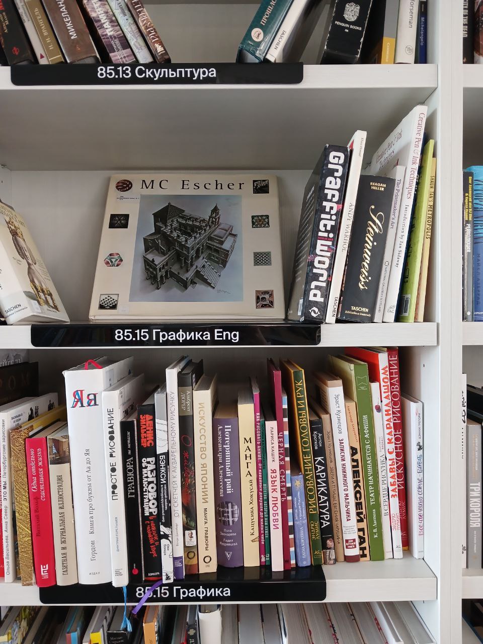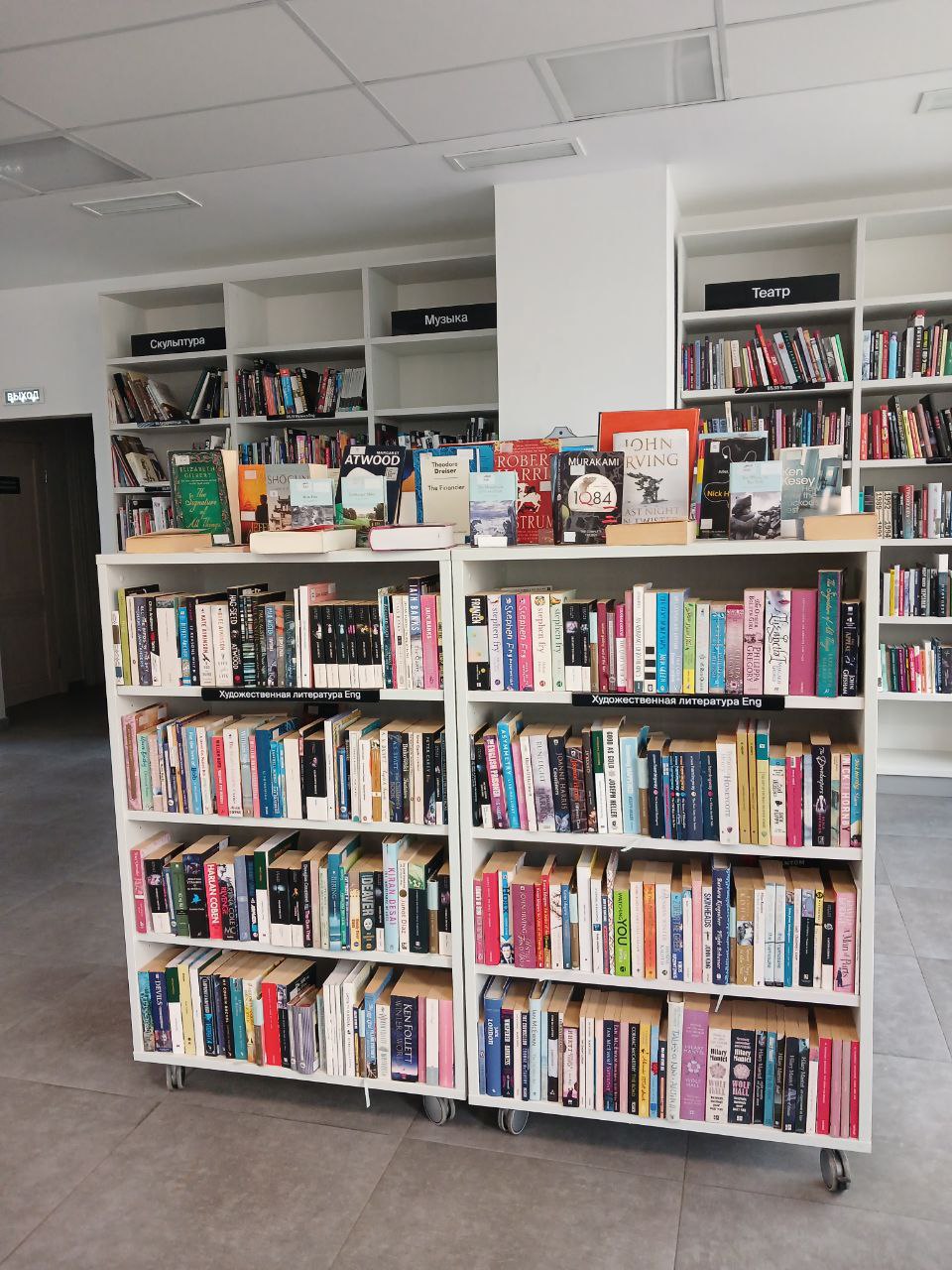 Художественная литература представлена на втором этаже. Она занимает большой шкаф-остров, и несколько шкафов рядом с ним. Есть и детективы, и романы, и фантастика. Также есть шкаф с книгами по языкознанию на русском и английском, и немного книг на других языках. В том же углу, на стене, находятся книги по искусству и кино — на русском и английском.