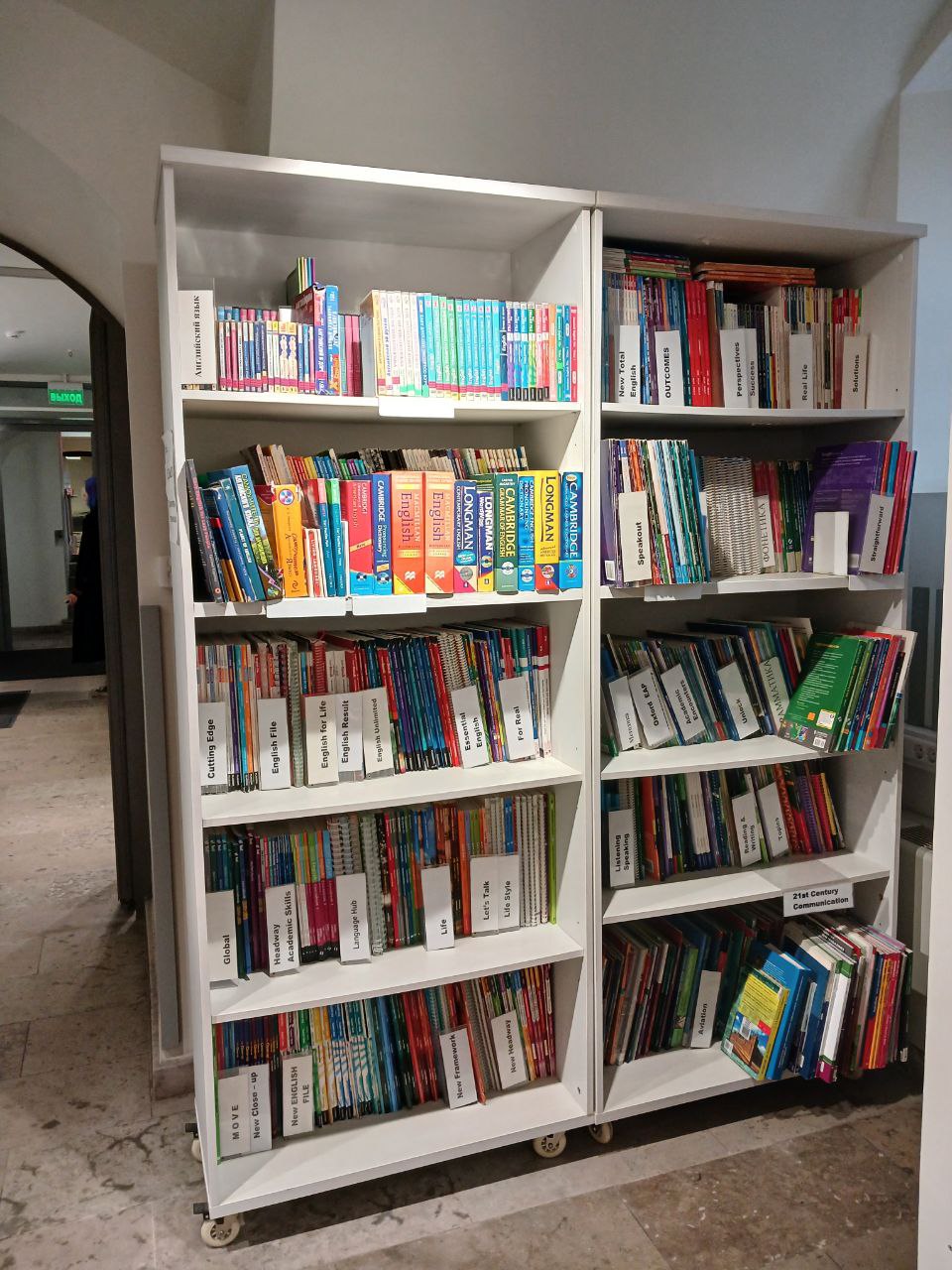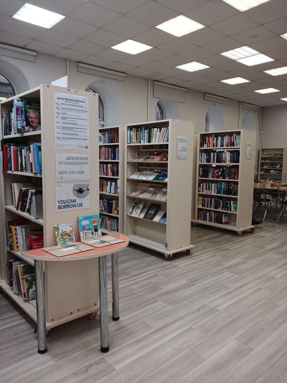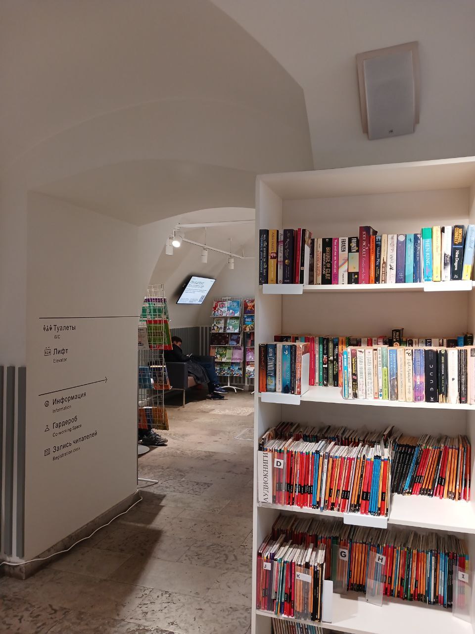 В некоторых библиотеках книг на английском нет, в некоторых есть одна—две полки. Иногда книги расположены в неожиданных местах, например, у пола — лучше уточнять их наличие у сотрудников библиотеки.