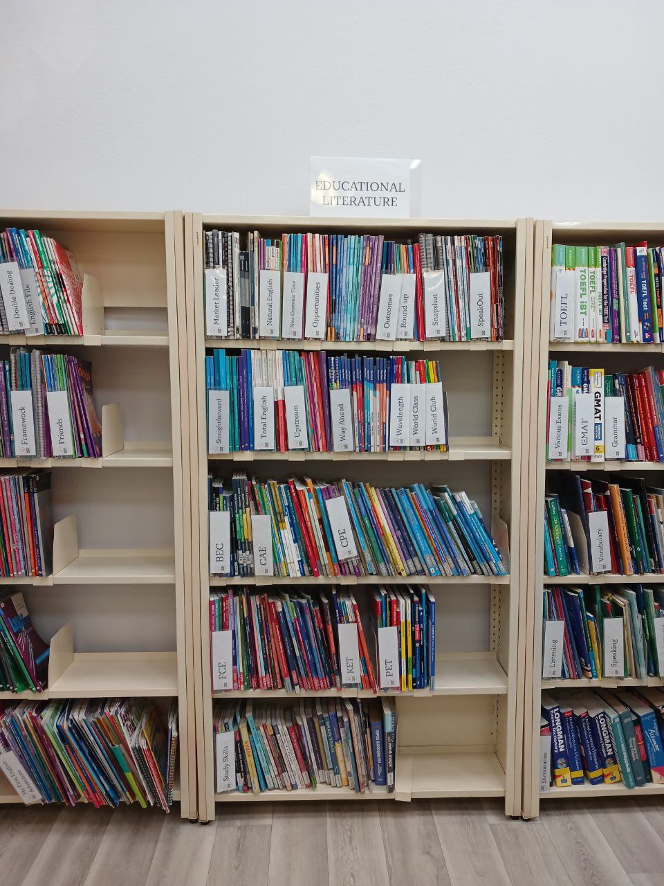 В библиотеке представлена художественная литература — целое помещение, несколько шкафов нон-фикшена и многообразие учебных пособий. Есть разделы с детской и подростковой литературой.