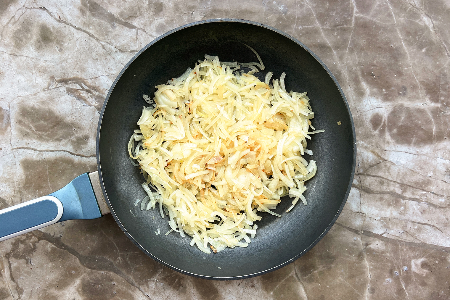 Шаг 7. Лук обжарьте в той же сковороде на среднем огне 3—4 минуты, постоянно помешивая, до мягкости и прозрачности.