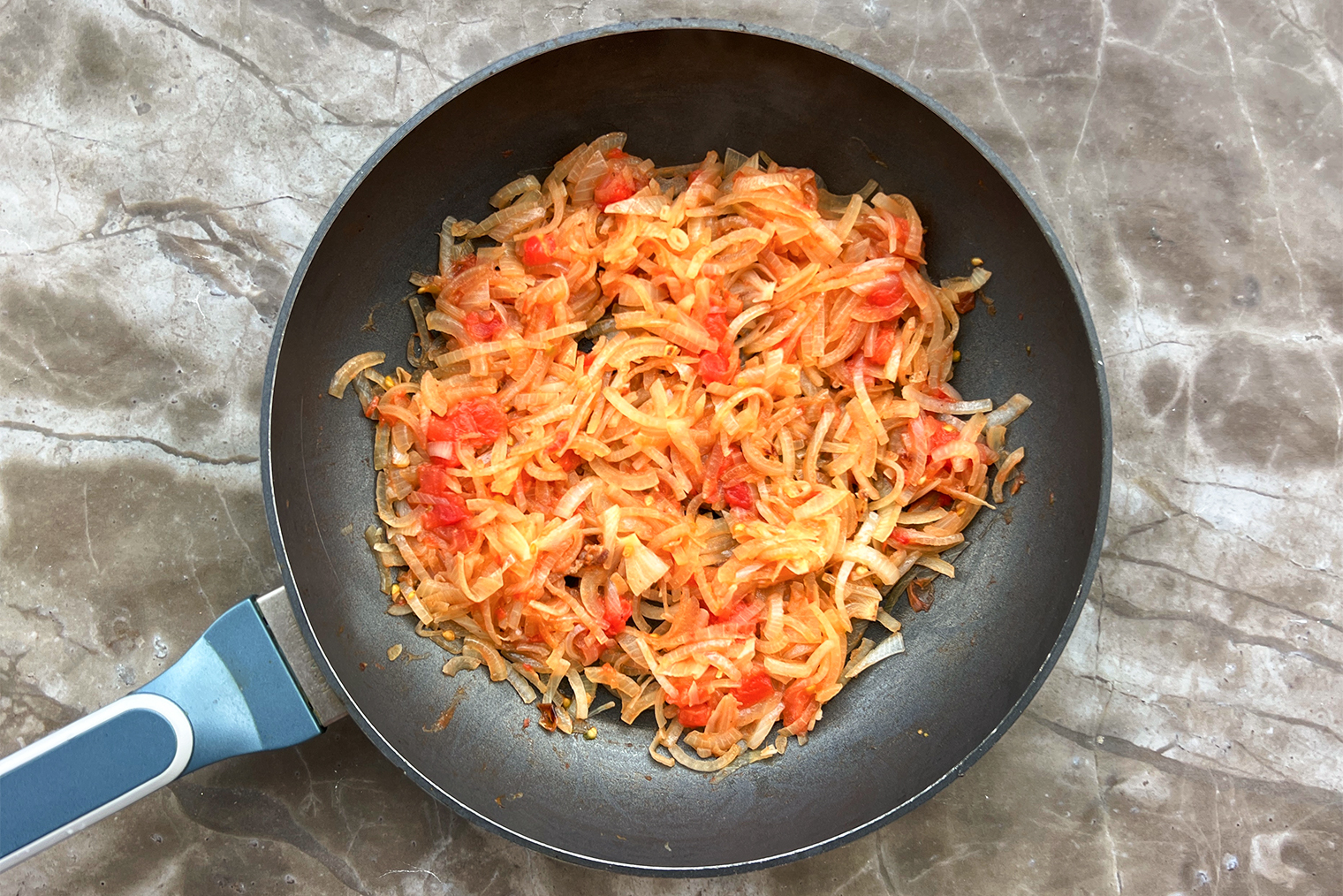 Шаг 8. Кубики помидоров добавьте в сковороду, обжаривайте еще 3—4 минуты.