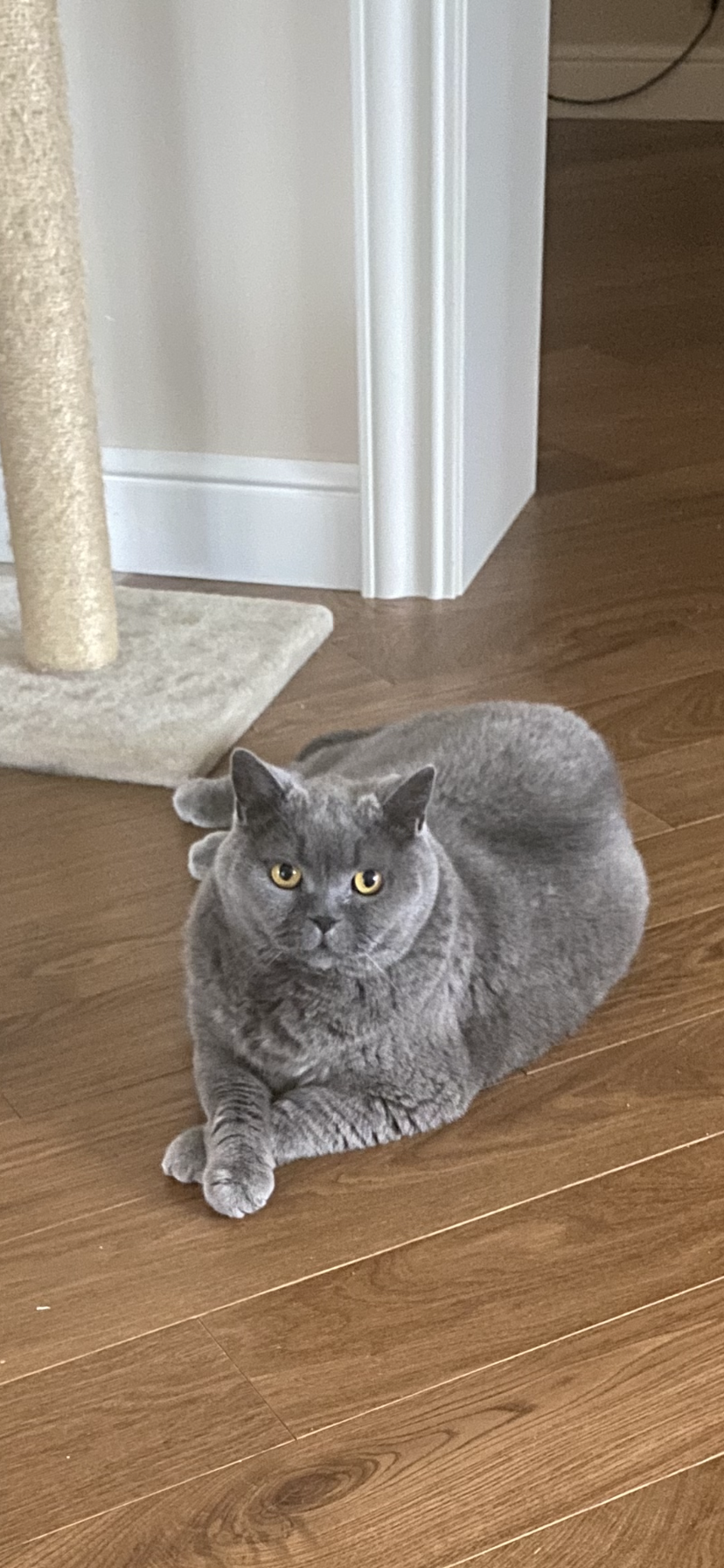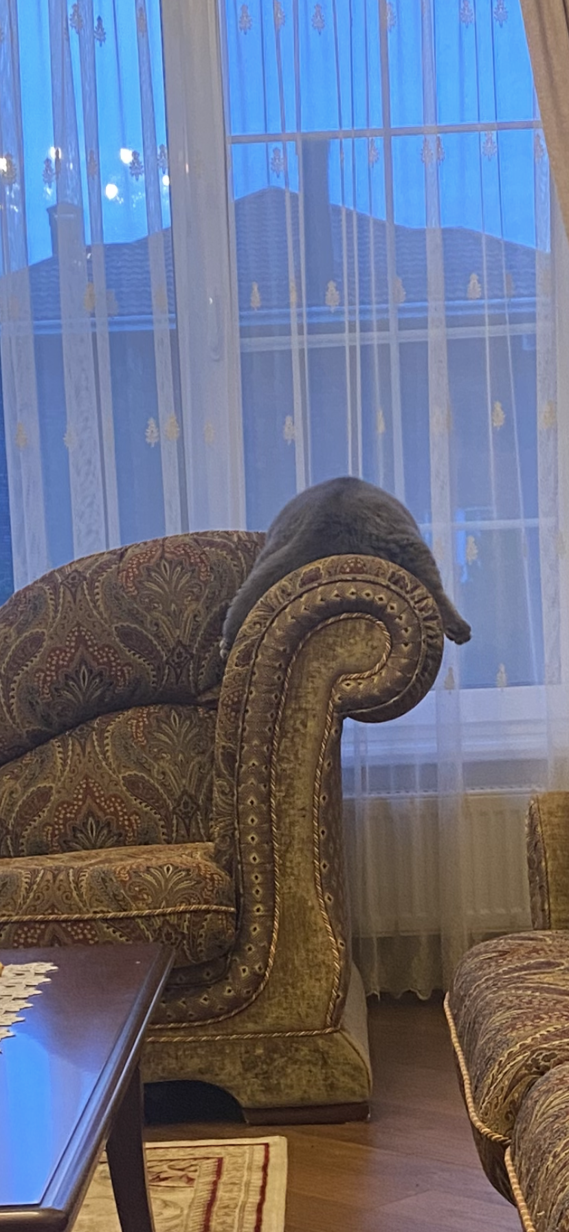 Боня британский кот очень любит спать на валике дивана «верхом». А его поза на полу — это голодный обморок. Боня так выпрашивает мясo.