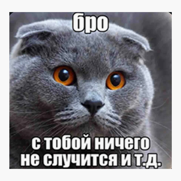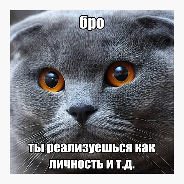 Фраза «бро, ты умрешь и т. д.» в сочетании с картинкой кота, как оказалось, идеально подходит для описания сложных, зачастую преувеличенно безвыходных ситуаций. Питомец в мемах словно призывает смириться и принять судьбу, подобно стоикам.