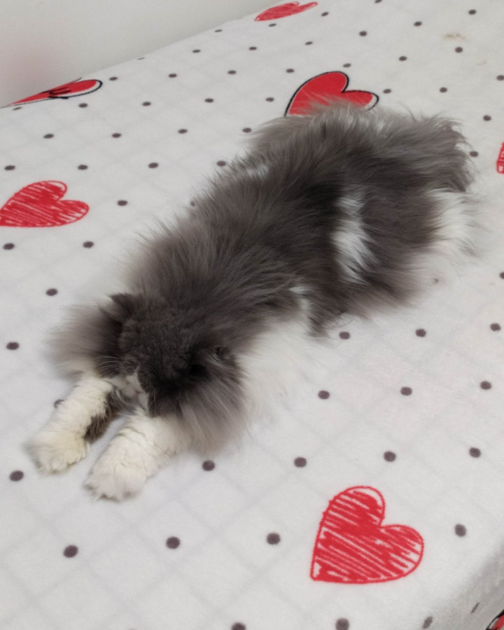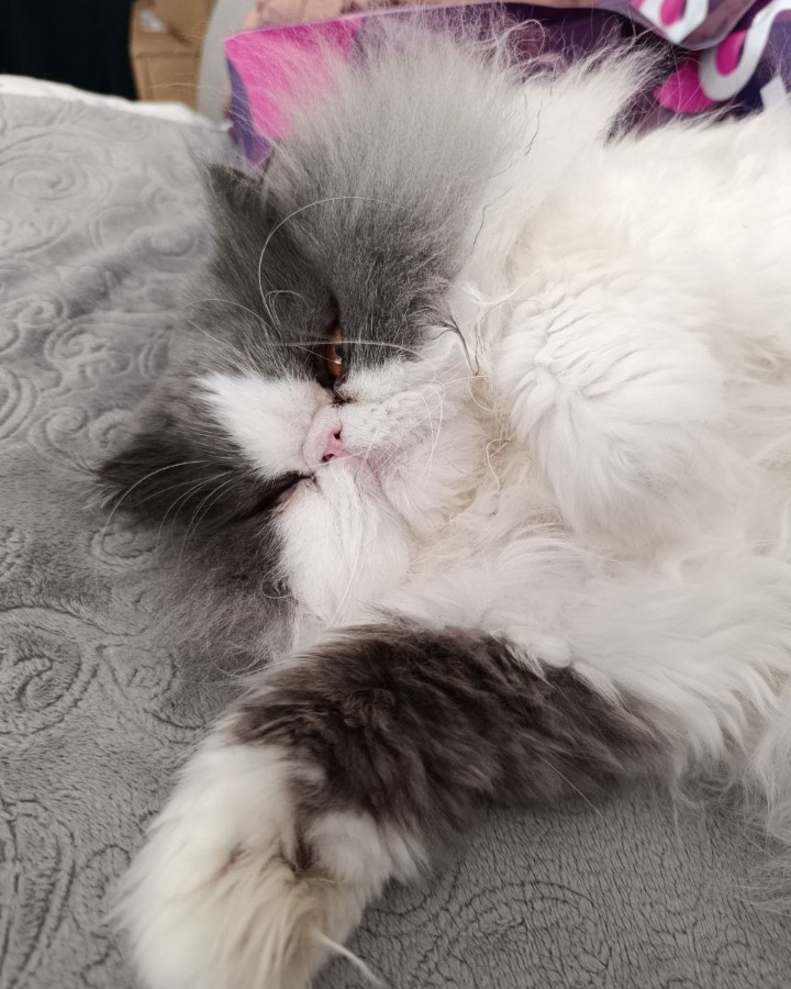 Уже более пяти лет этот парень украшает нашу жизнь. Спит где хочет, ест как король, у него чемодан игрушек, которые иногда он лениво перебирает. Весь день этот парень спит, а ночью скачет, а это почти 7 килограммов счастья! Любим его, балуем!