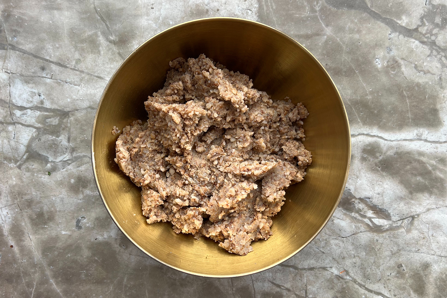 Шаг 4. Гречку остудите до температуры, при которой вам комфортно работать с крупой. Пробейте погружным блендером до однородной вязкой консистенции.