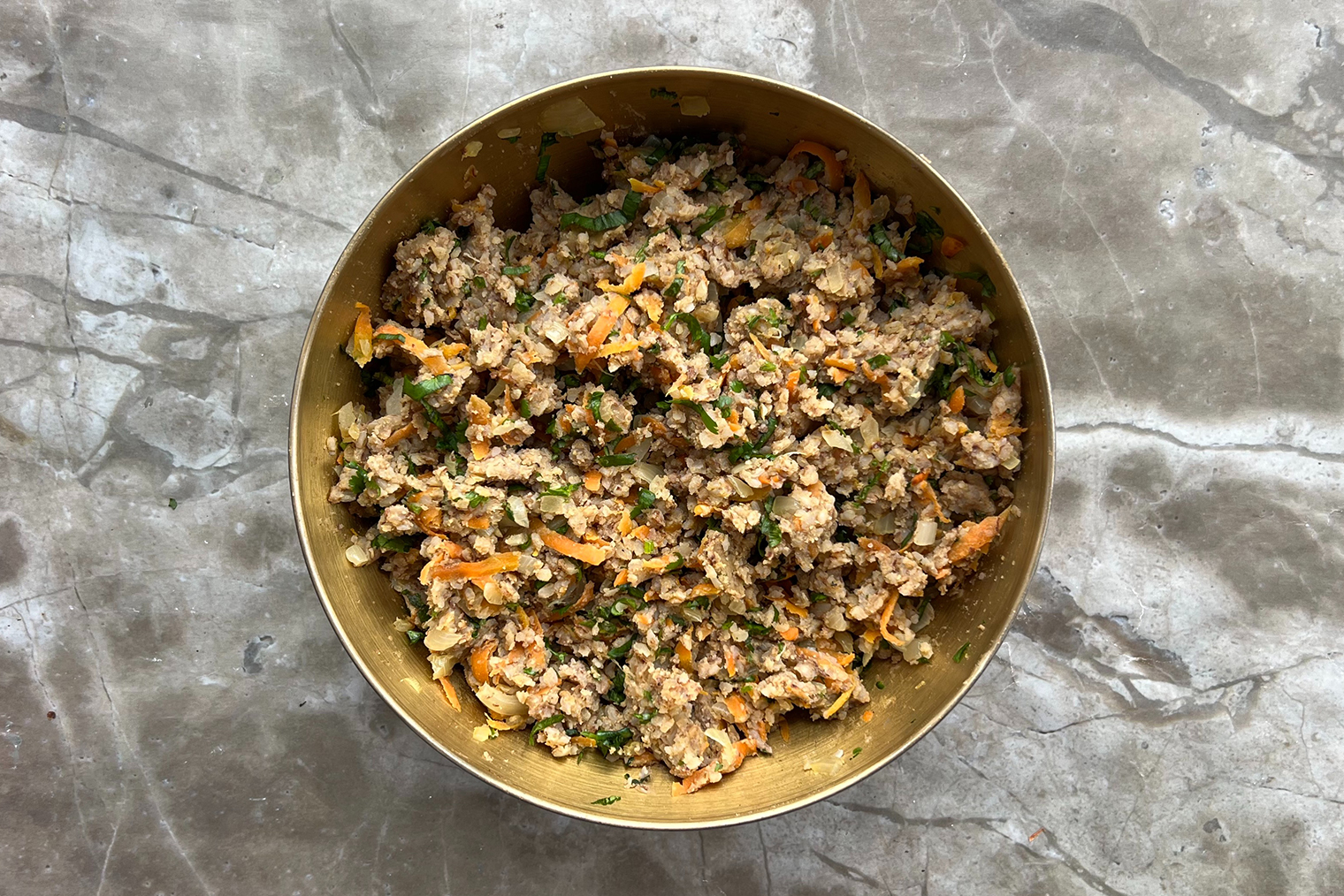 Шаг 5. Кинзу мелко порубите, добавьте к гречке вместе с обжаренными овощами, солью и перцем. Перемешайте массу руками.