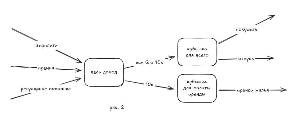 Сценарий 2 (Начало контроля). Это, когда зарплата все так же приходит на карточку, но какая-то часть регулярно откладывается. Например, с каждой зарплаты по 10к на аренду. Такое можно схематично изобразить как на рисунке 2.