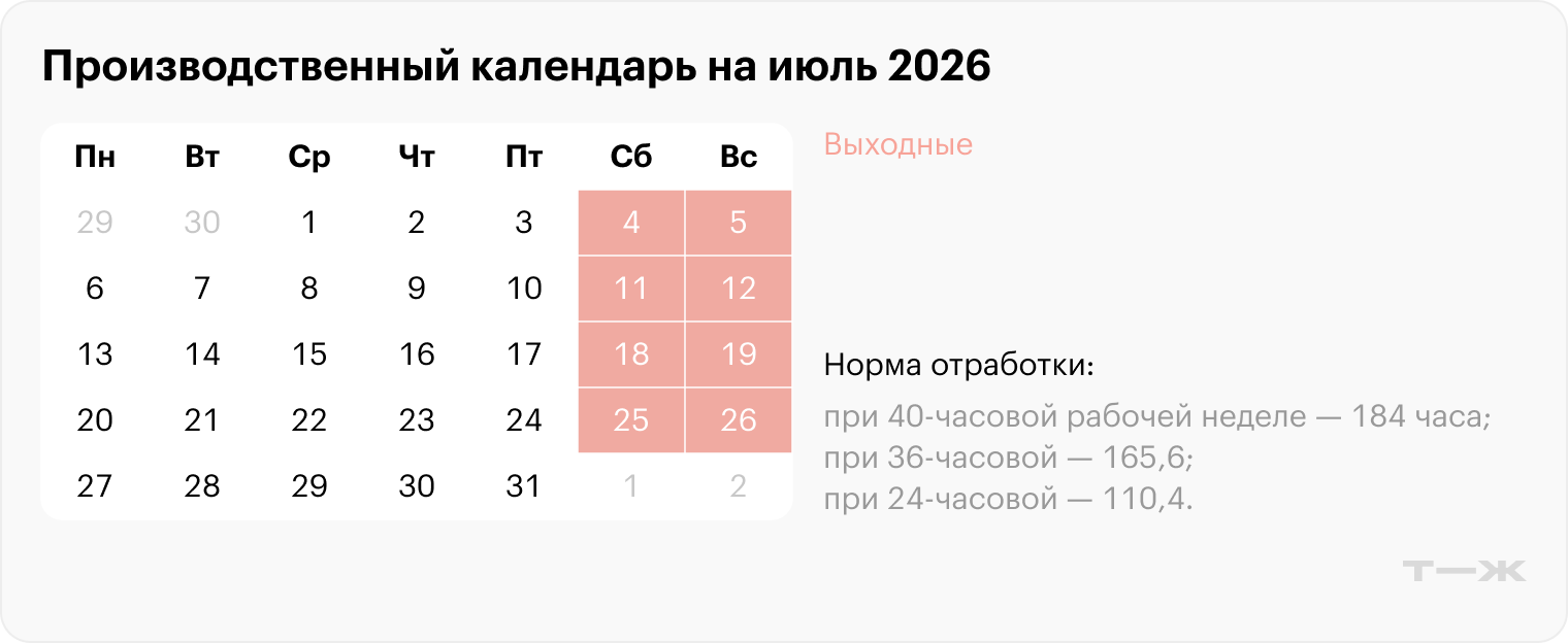 На его основе считают норму рабочего времени, планируют график работы, отпуска и начисляют зарплаты. Производственный календарь на весь 2026 год опубликовали в другой статье, а здесь рассказываем, как будем работать и отдыхать в июле.