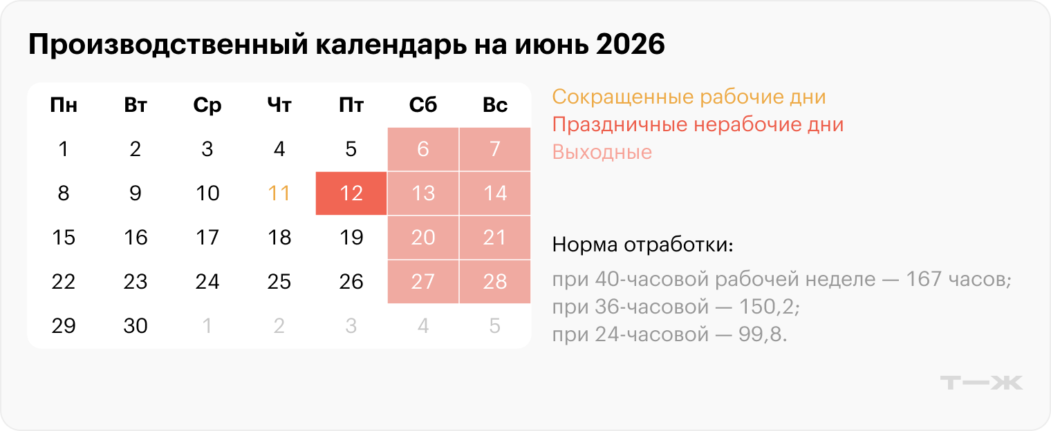 На его основе считают норму рабочего времени, планируют график работы, отпуска и начисляют зарплаты. Производственный календарь на весь 2026 год опубликовали в другой статье, а здесь рассказываем, как будем работать и отдыхать в июне.
