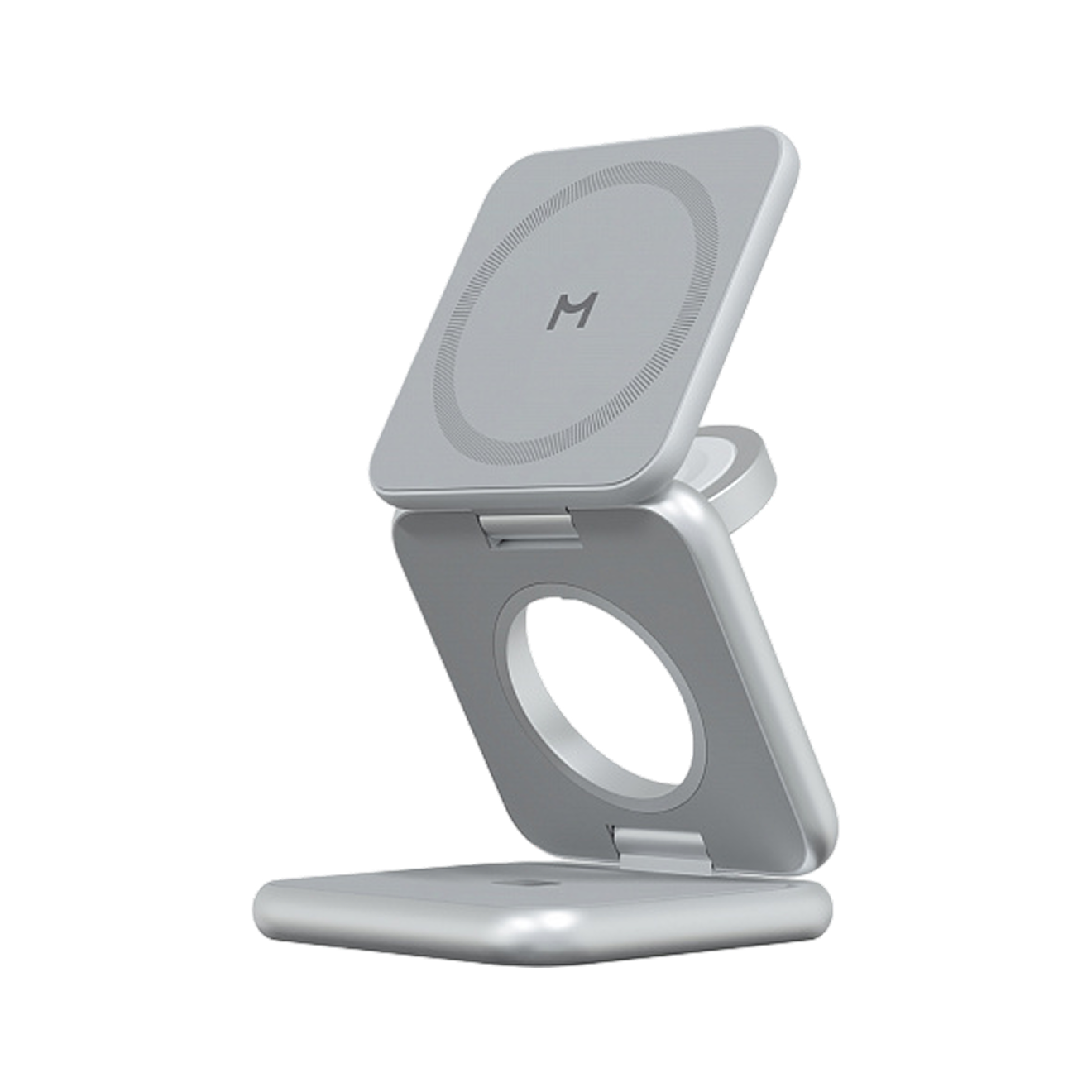 Компактная беспроводная станция сразу для трех устройств с поддержкой протоколов быстрой зарядки Qi, Qi2, PD и QC. Сделана из сплава цинка. Угол наклона можно отрегулировать