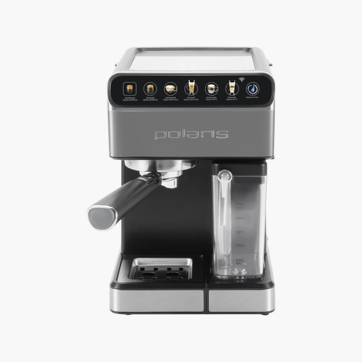 Альтернатива 1. Polaris PCM 1540 WiFi IQ Home — кофеварка с очень большим резервуаром для воды и автоматическим капучинатором. Одним нажатием на кнопку готовит эспрессо, капучино или латте, при этом любой напиток можно получить в двойном варианте сразу.
