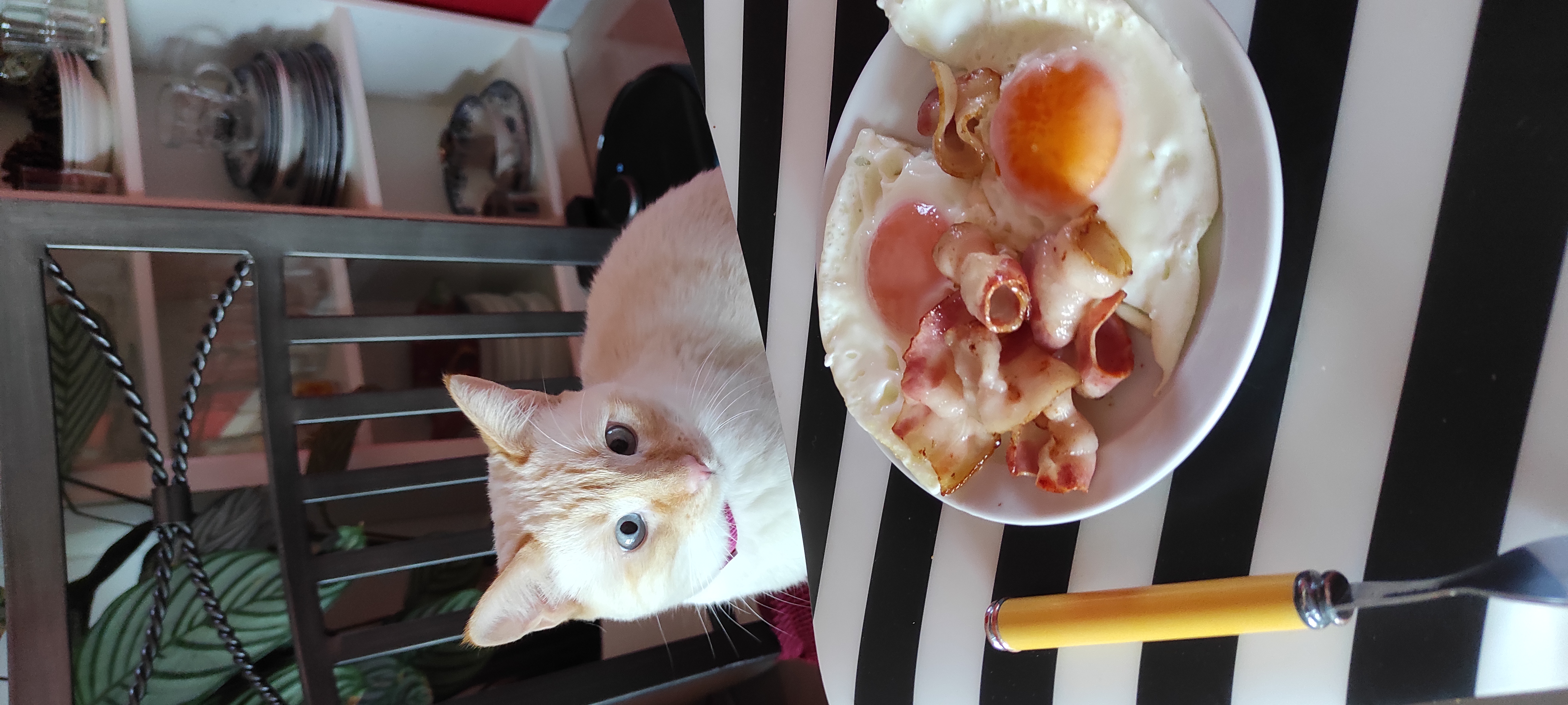Злые люди, бедной киске не дают стянуть сосиски… Вот так мы завтракаем..