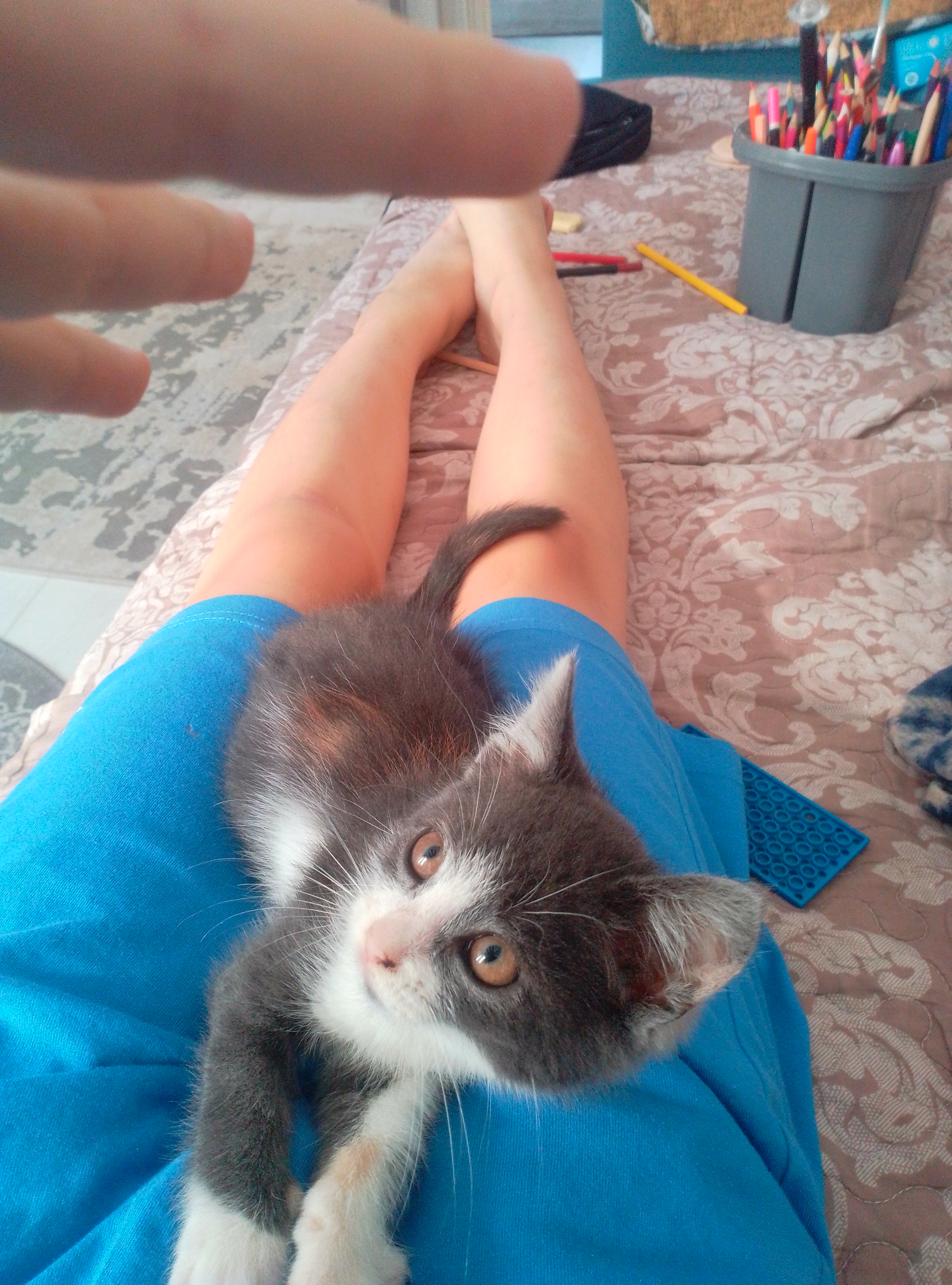 Бусю мы подобрали в октябре, она сидела в коробке возле магазинов. Маленькая, испуганная. Подобрали, что ж поделать. Первые дни боялась и была спокойной. Потом включила мод бесятора-3000 и начала бегать по дому.