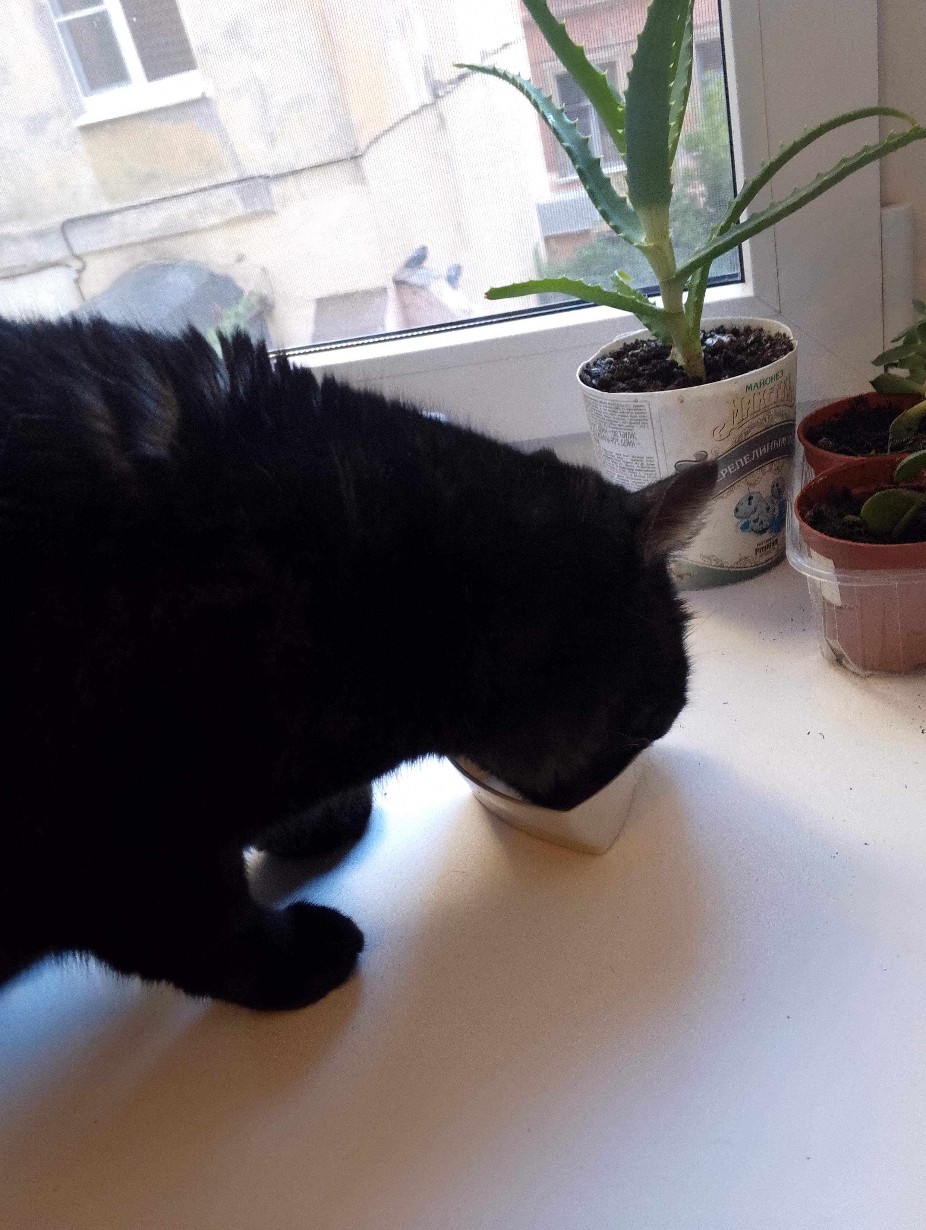 Кот страшно социальный. Он любит людей и принимает участие в трапезах и вообще во всех делах. Выходит к моим пациентам. Играет со всякой фигнёй, вроде палочки от банана или огуречной попкой. Ну, и в футбол гоняет. Посещает туалет в виде домика. Сразу освоил. Причём, любит это делать, когда люди идут в свой.