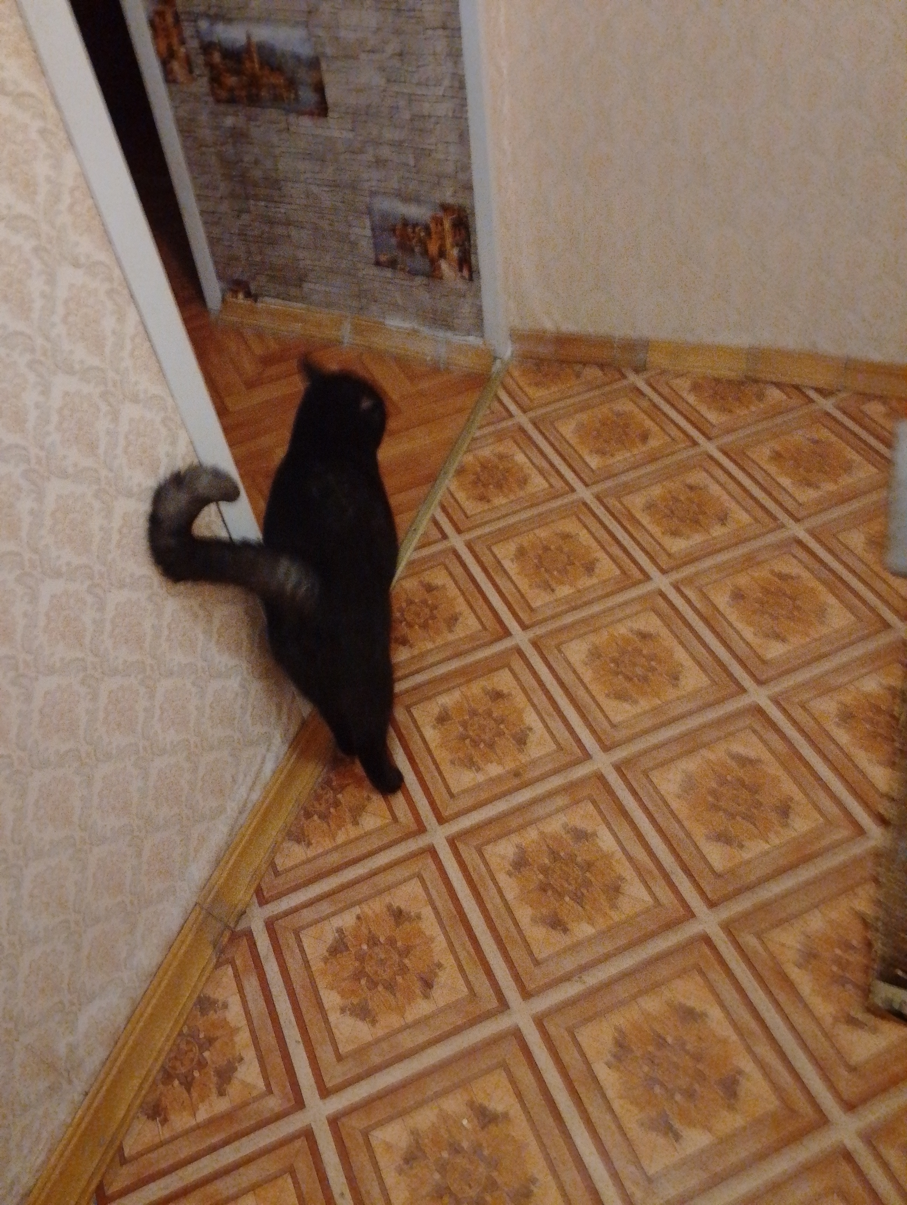 Мы договорились с Ольгой. Она привезла кота в центр. Чтобы нам не мотаться за город. Мы в центре живём. Кот был просто нереальный. Чёрный дым — так масть называется. Изнутри он белый. А мех — как у медведя, густой. Ему было около двух лет, а приехал он из Чечни. Прожил в приюте неделю. Посадили в переноску и привезли домой.