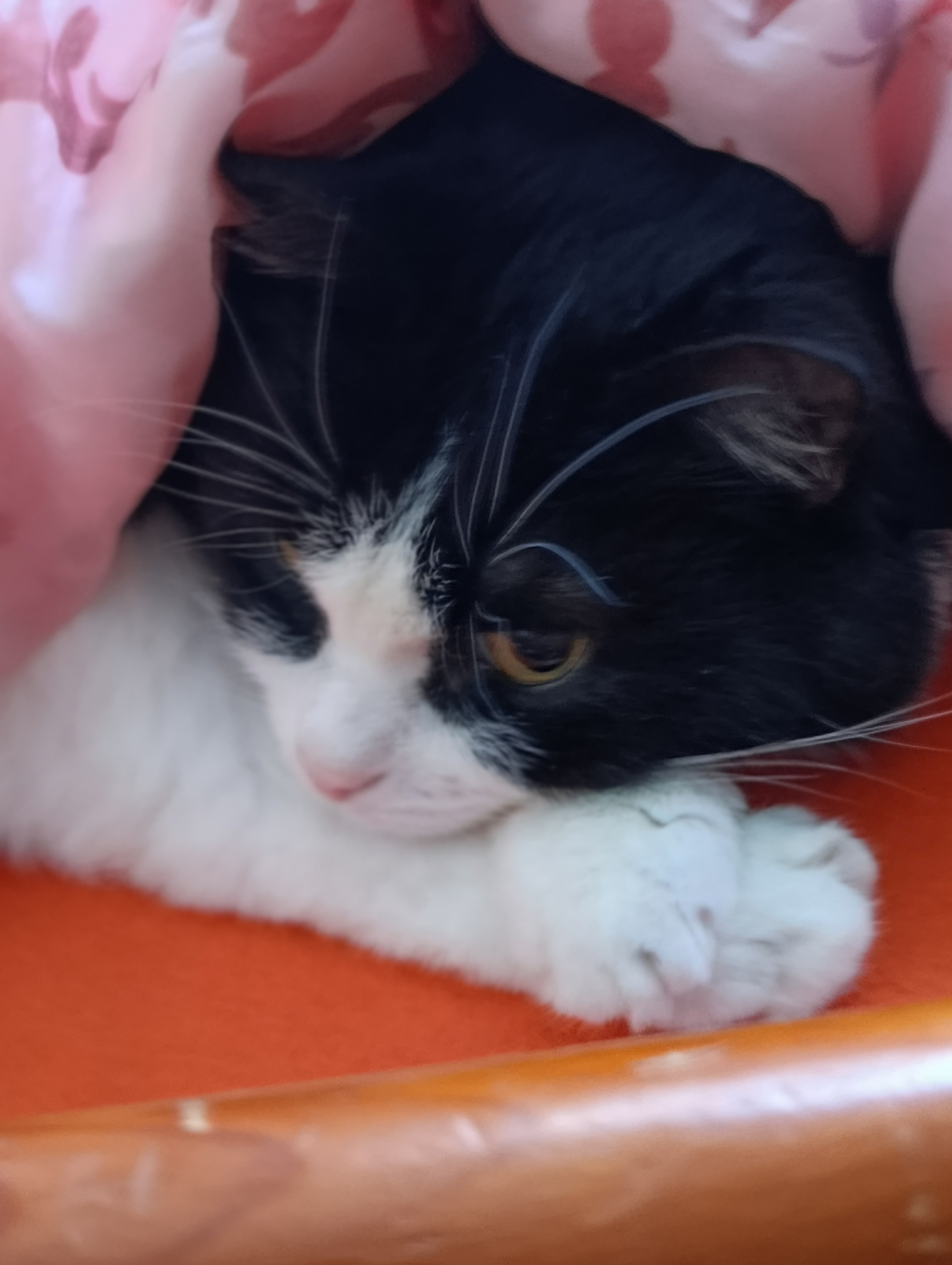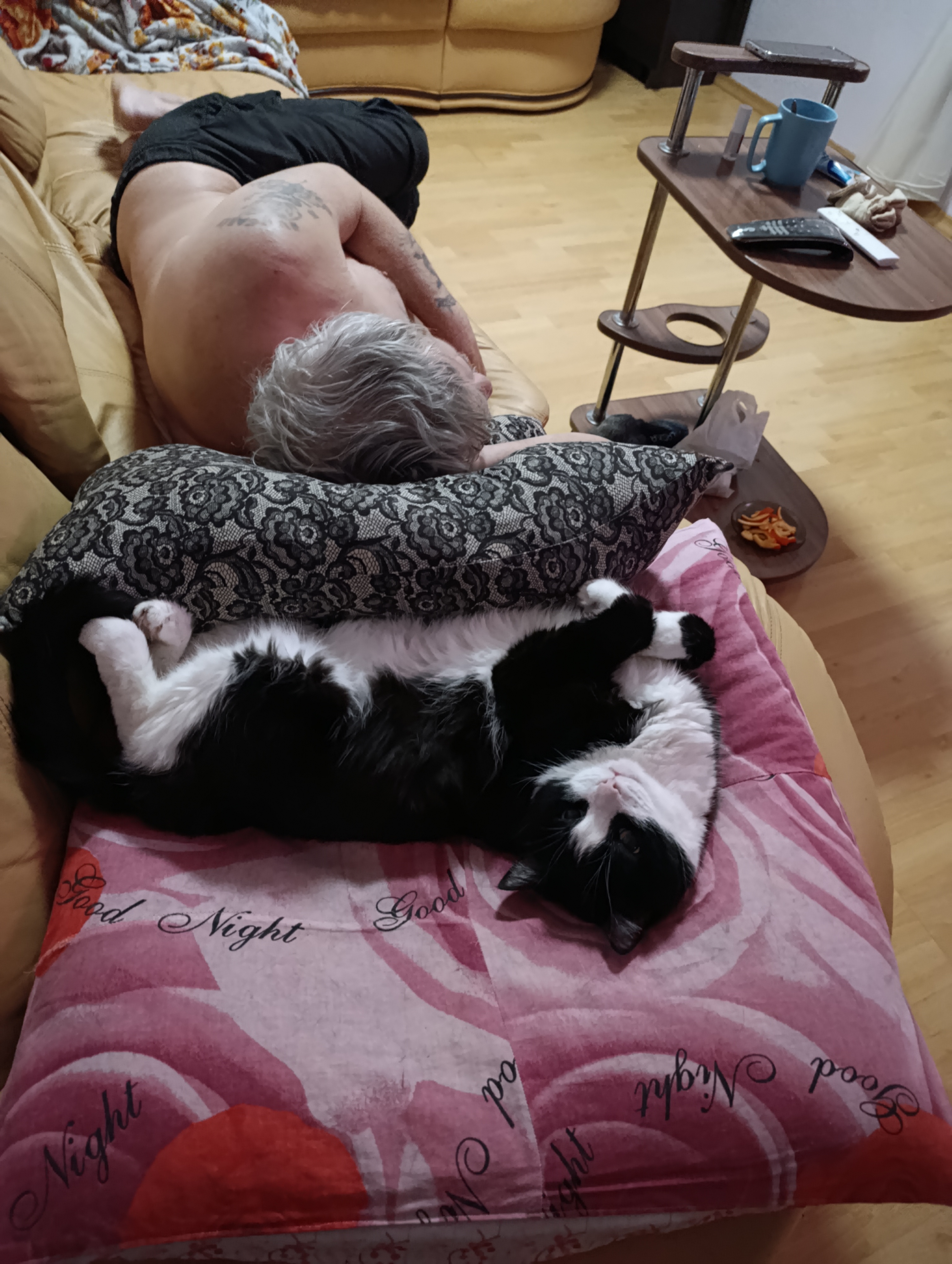 Я его нашла грязныйм, маленьким и больным зимой на улице. Теперь он у нас в семье Царь. Спит только на подушке рядом с папой.