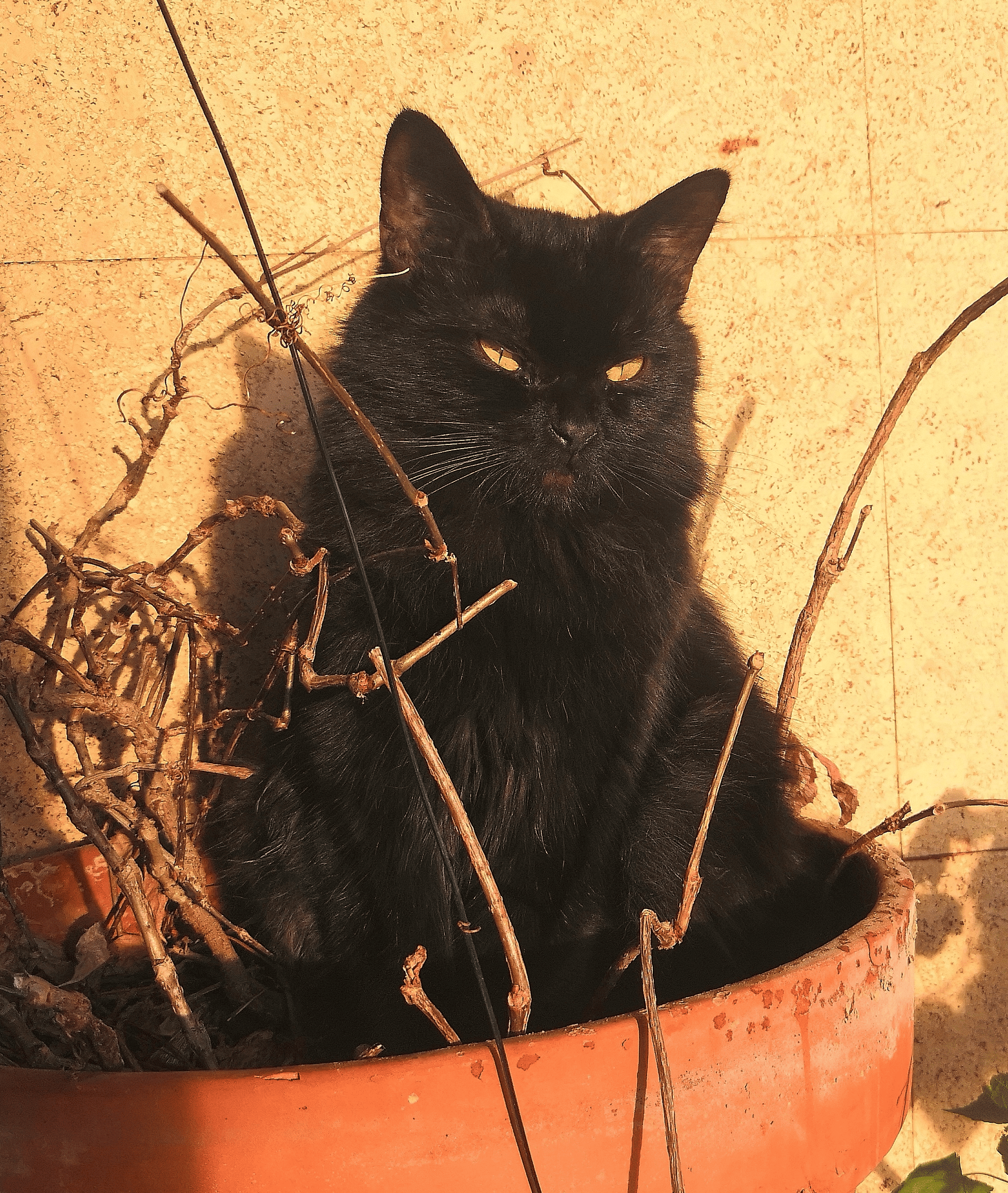 Кришна — кошка сына, молодая, веселая, ласковая. Абсолютно черная кроме жёлтых глаз.