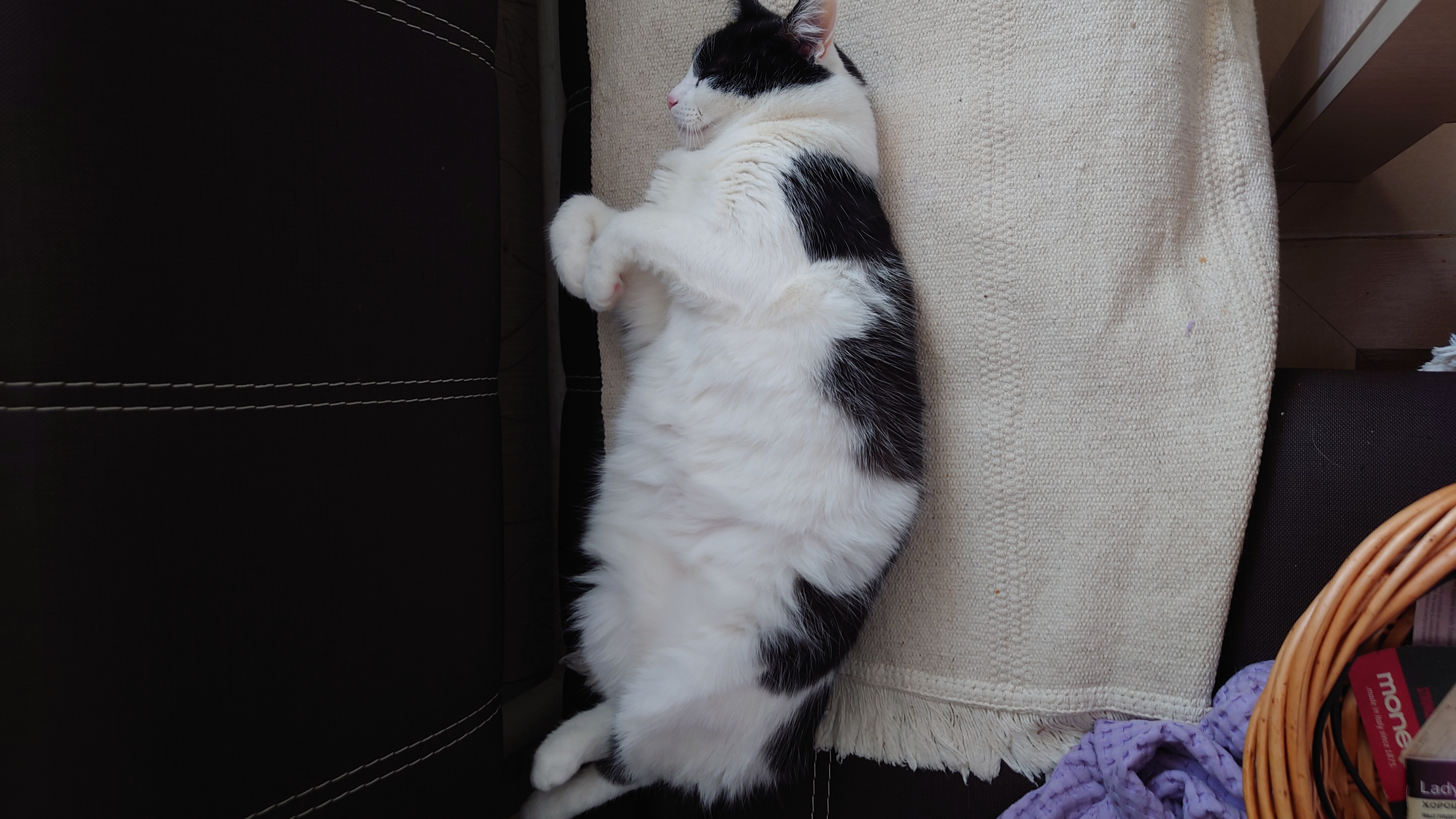 Люся быстро привыкла к новой жизни. Сразу пошла в лоток, обследовала новое жилище, выбрала себе местечки. Несколько любимых — на кухне в корзине или на когтеточке картонной, в комнате на лежанке, на компьютерном столе, в кресле, есть и другие, но больше всего любит лежать у меня на коленях. И все время рядом со мной, ни на шаг не отходит. Очень ласковая и послушная.