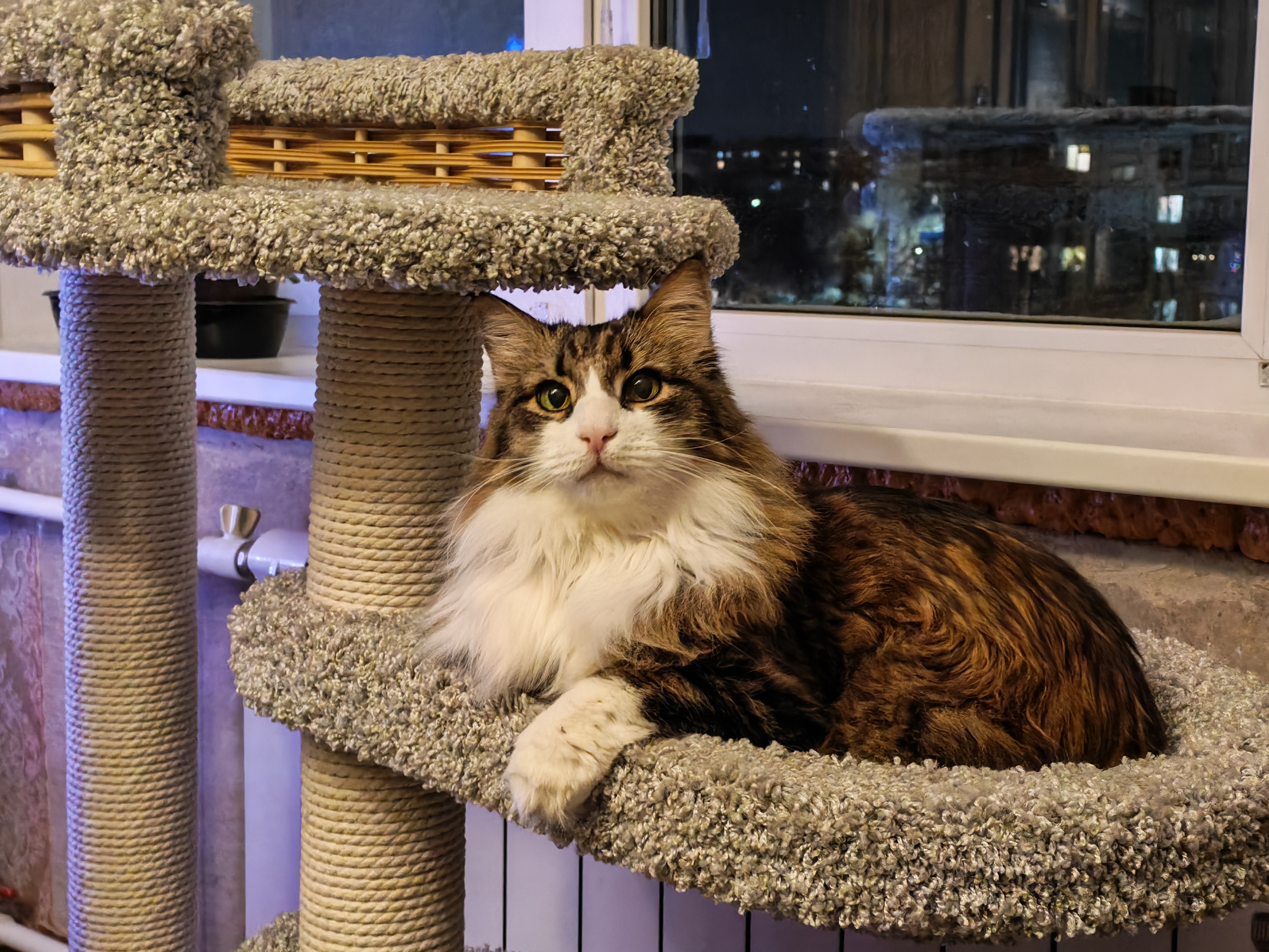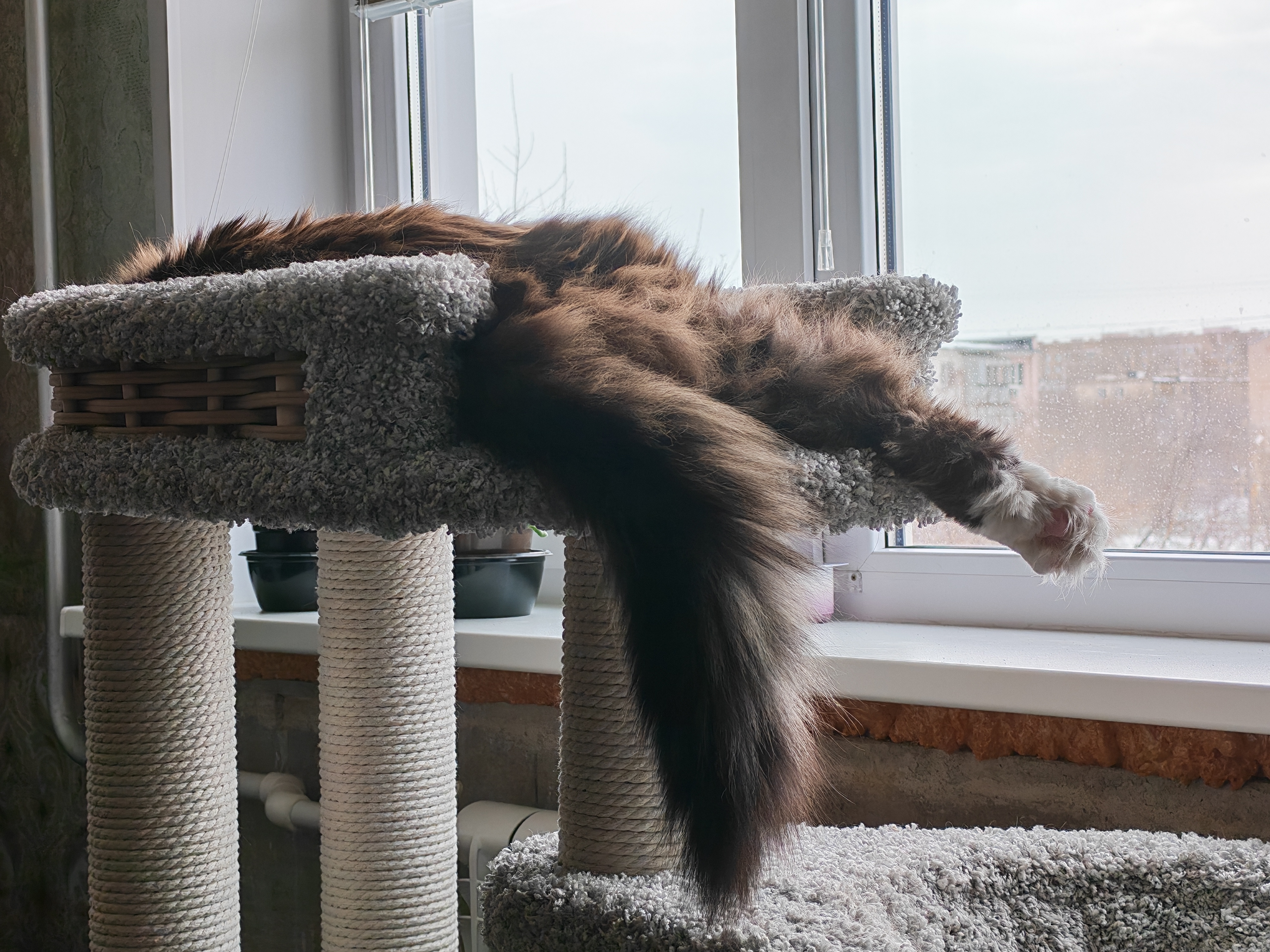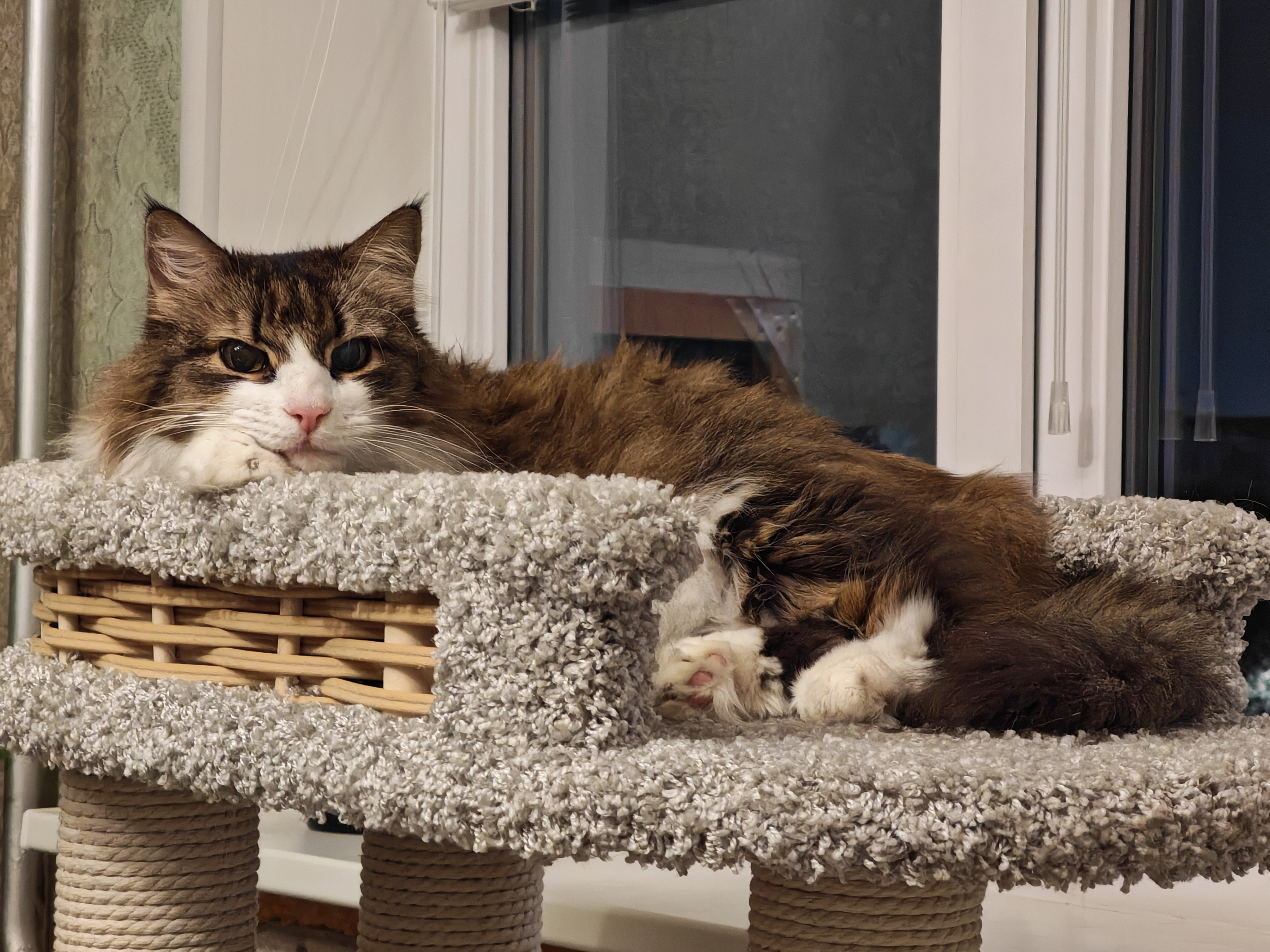 Фото питомца: кот Мурчик лежит на любимом игровом комплексе
