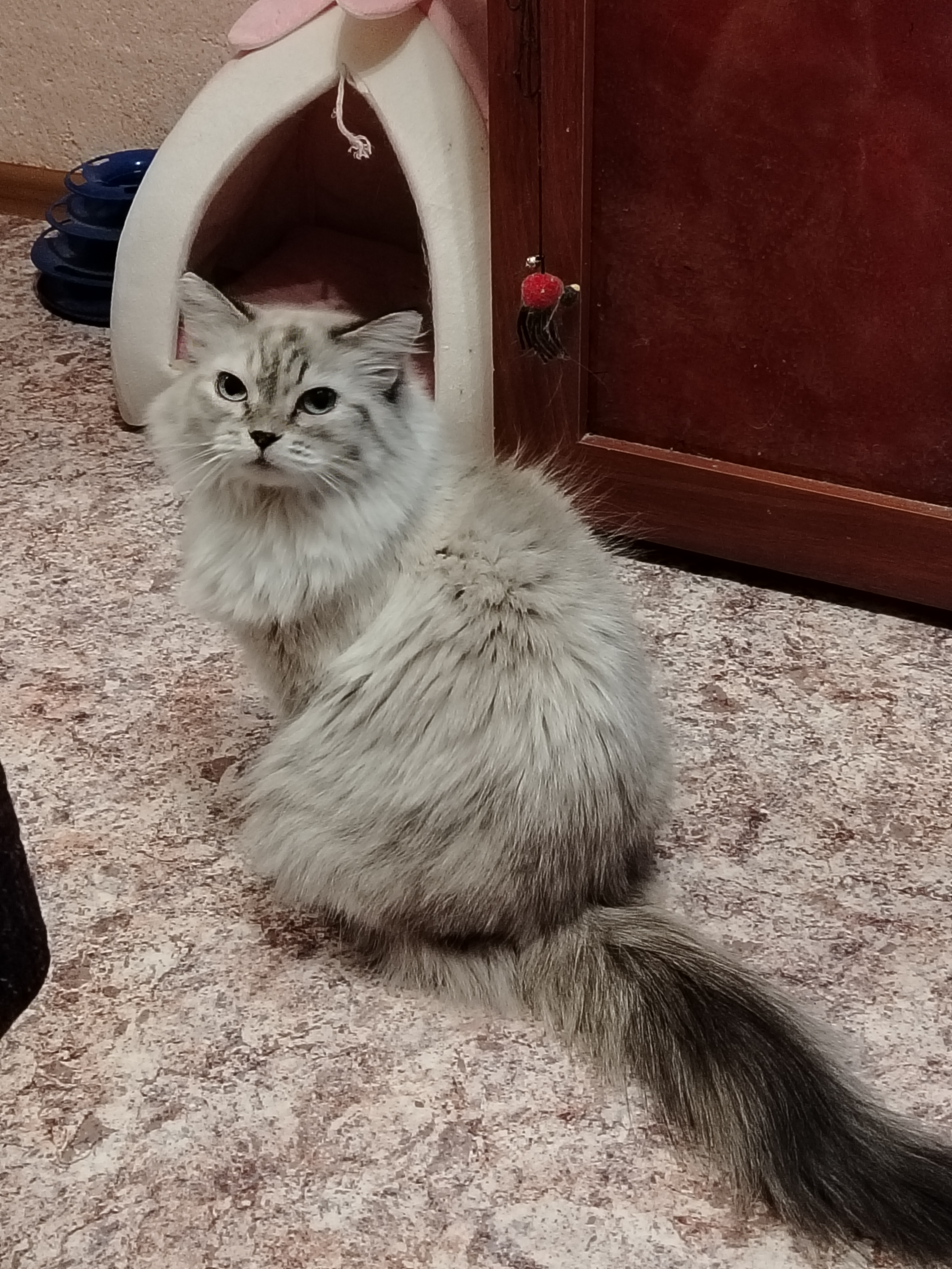 Сейчас Муся освоилась и превратилась в обычную городскую кошку. Она очень ласковая и контактная. В силу возраста кошка не такая активная, как Соня, поэтому преимущественное время спит. Но любит покушать, возможно сказалась жизнь на улице. Поэтому часто подходит к своей миске, любит мягкие кошачьи консервы, как и Сонька, но может и погрызть сухой корм. Глаза почти не слезятся, так как мы стараемся протирать глазными каплями и чаем, также как и чистим ей уши. Раньше, когда мы только её взяли, шерсть на ней висела клочками. Но теперь она обросла и превратилась в очень важную длинношерстную пушистую кошку.