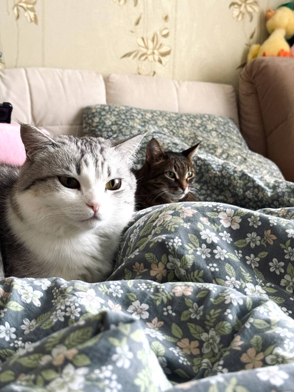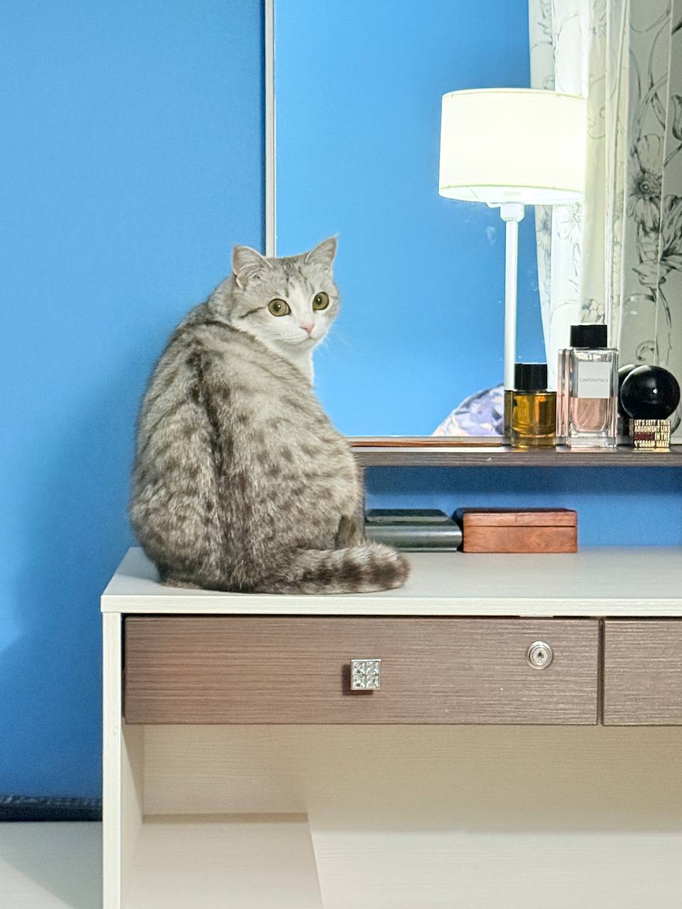Мои лапушки отдыхают. Нюша любовалась собой в зеркале,когда мы вошли в комнату)). Тихон на кухонном стуле ждёт ужин.