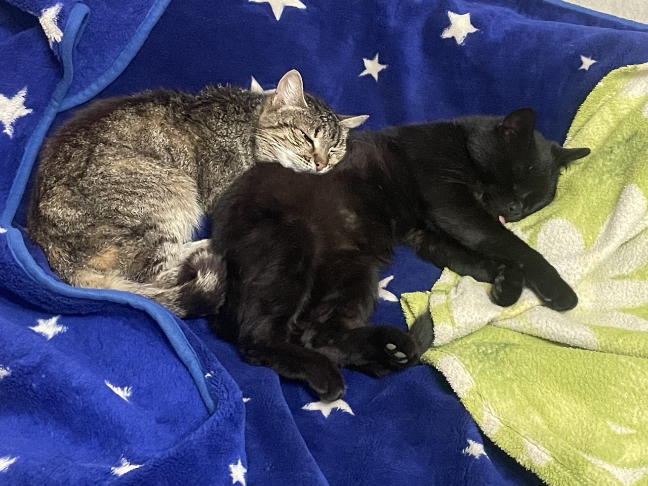 Нюша где-то через месяц, к сожалению, пропала — может быть ушла туда, откуда пришла к нам, может быть с ней случилось что-то. О плохом я предпочитаю не думать. Рыжую мы отдали бабушке с дедушкой — сейчас она живет еще с двумя котами, не скучает. Со старушками попрощались лет пять назад, это было болезненное расставание для меня, но я понимала, что они прожили очень долгую и счастливую жизнь. И тогда остались у нас три черныша — Тимон, Пеппа и Мася. Тимон зимой 23-го покинул наш дом. От болезни. Вероятно, в очередной драке с котами за территорию заразился. Тоже очень грустно было. Мася тоже "куда-то" ушла в то же примерно время. И сейчас у нас живёт только Пеппа.
