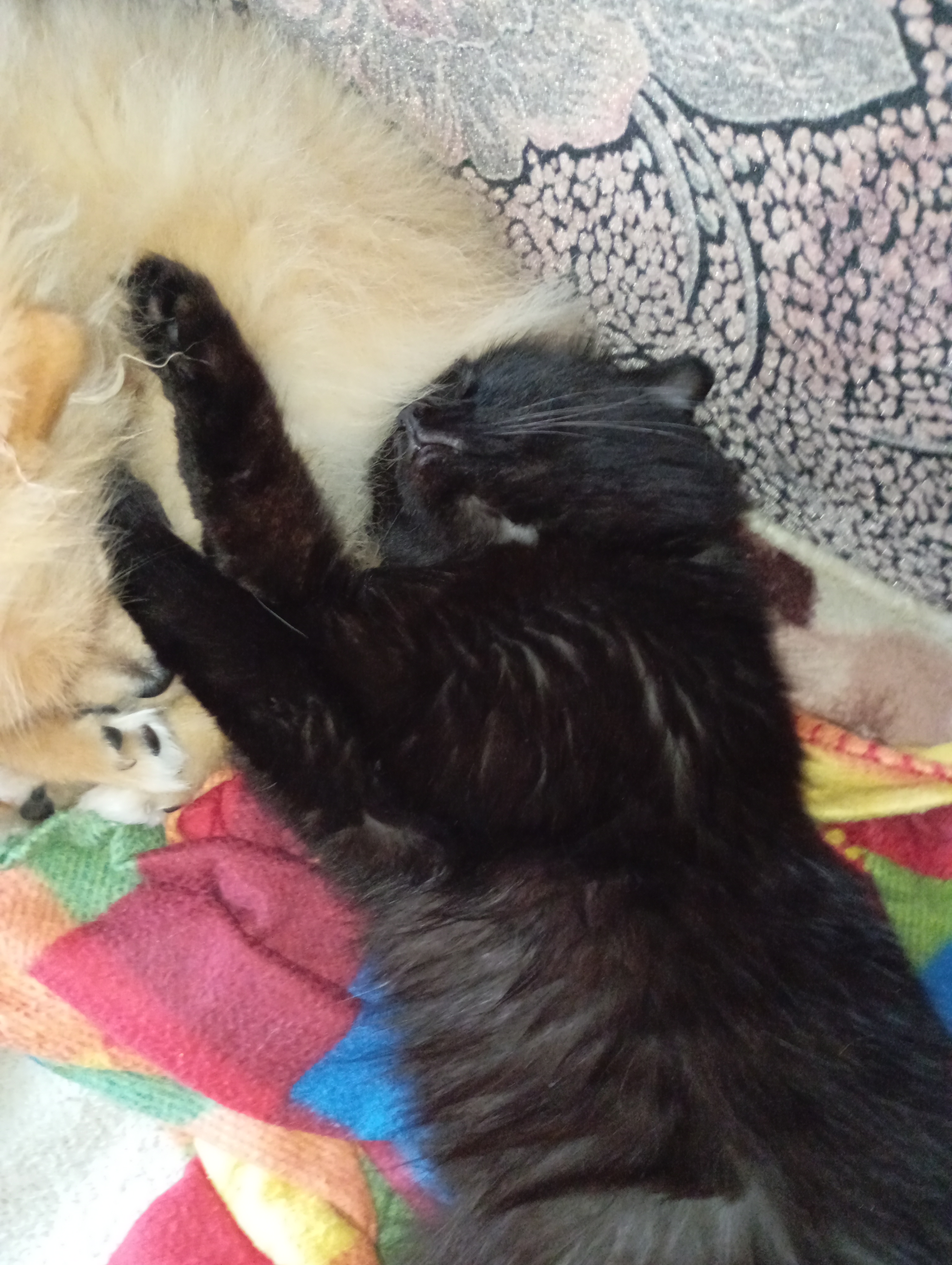 Фото питомцев: кошка Ночильда уснула, пока умывала собаку Минькову