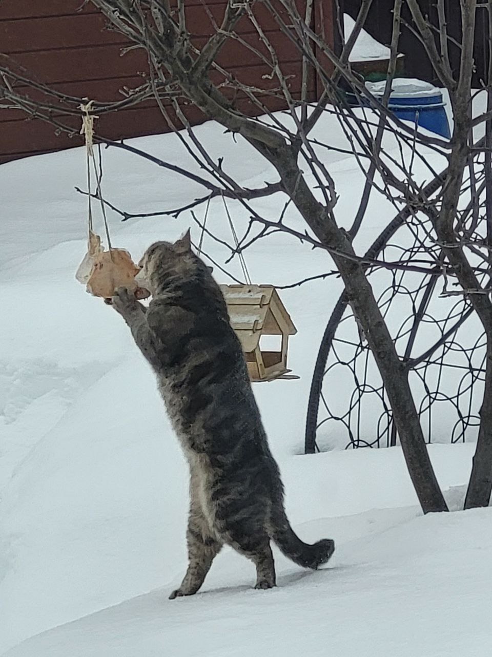 Чей-то деревенский котейка, наверное, так хорошо потусил с кошечками 8 марта, что пришёл закусить!