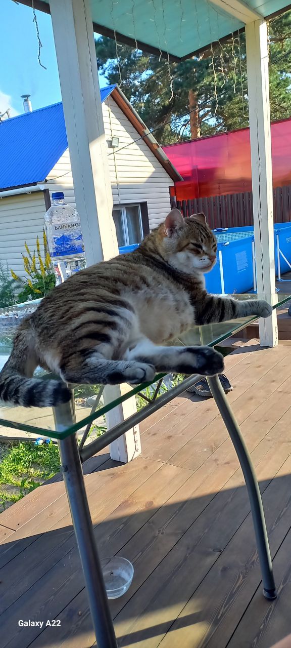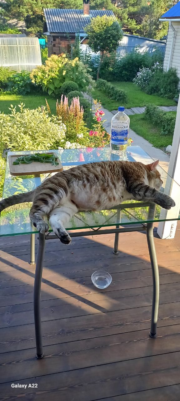Летом на нашей даче очень жарко,на участке нет высоких деревьев и поэтому солнышко лупит там в полную мощь. Единственное место,где есть защита от солнца и ветерок — это небольшая терраса, коты охлаждаются на стеклянном столе,ну и получают свою порцию ласки от проходящих мимо,- на столе то ближе ручкам до котика дотянуться и погладить)))