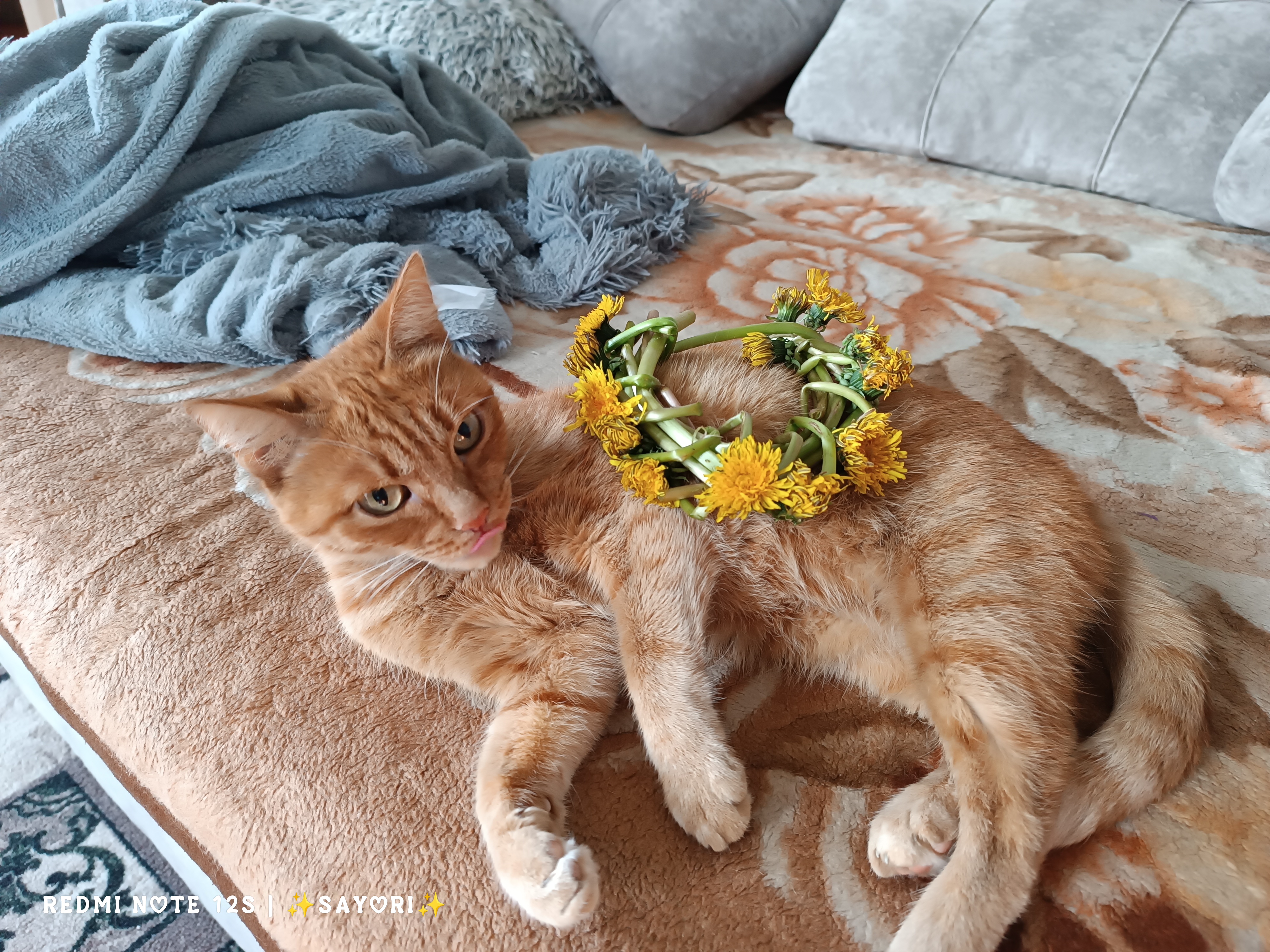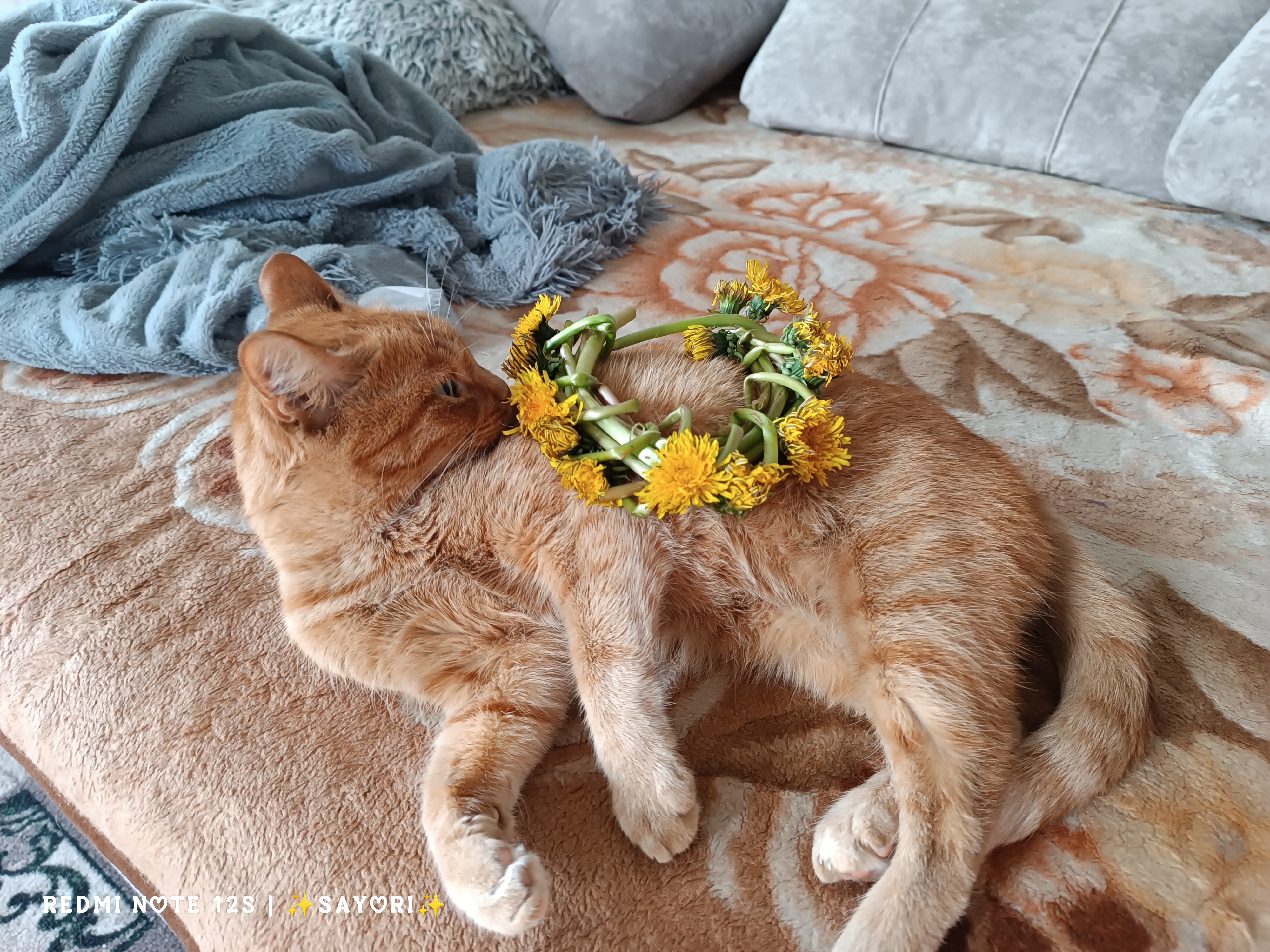 Фото питомца: кошка Василиса оценивает венок из одуванчиков