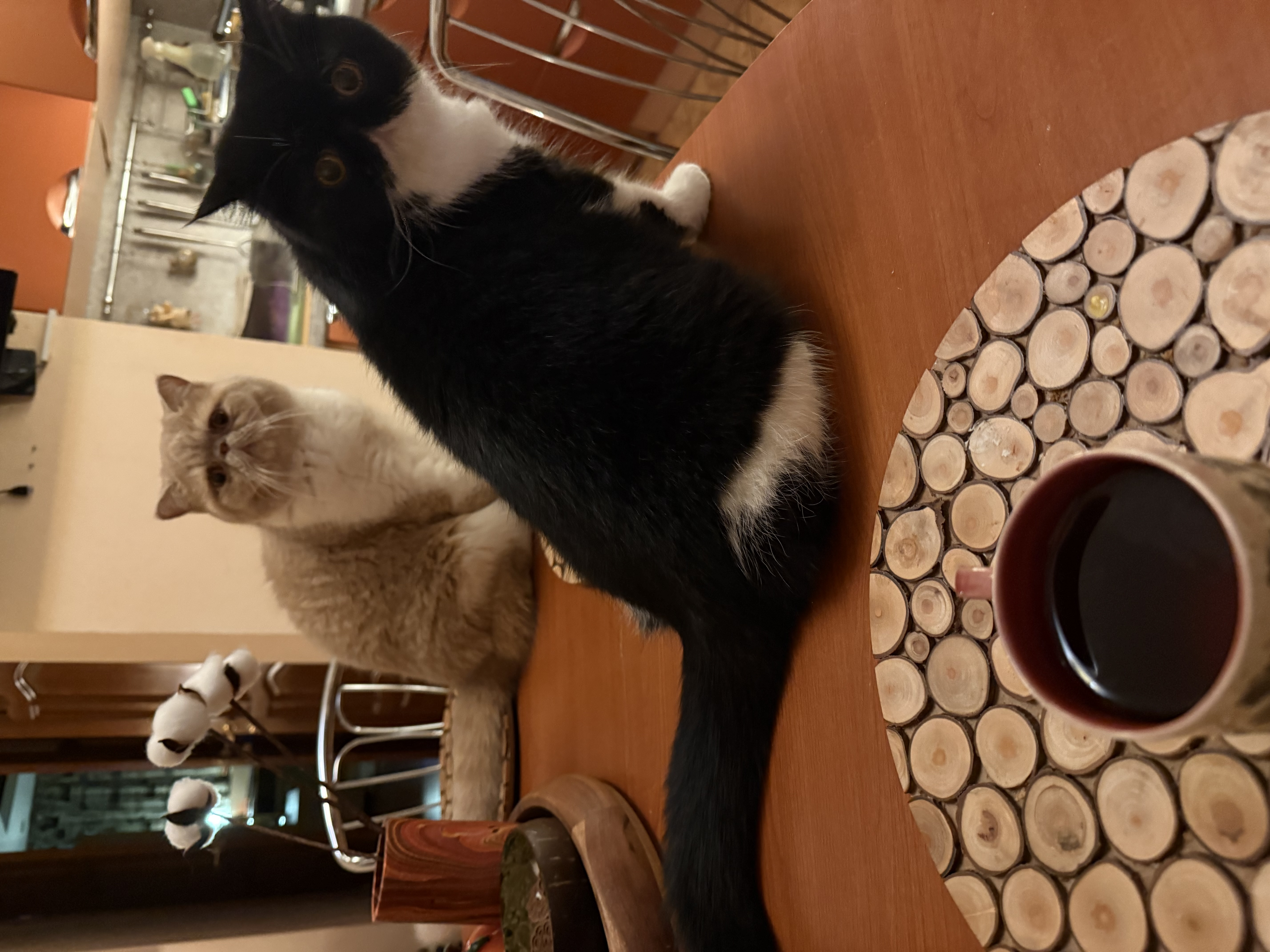 Фото питомцев: кот Этьен и кошка Кармеша сидят на столе