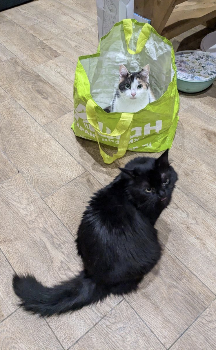 Фото питомцев: кошка Мотя сидит в сумке, а кот Криша рядом
