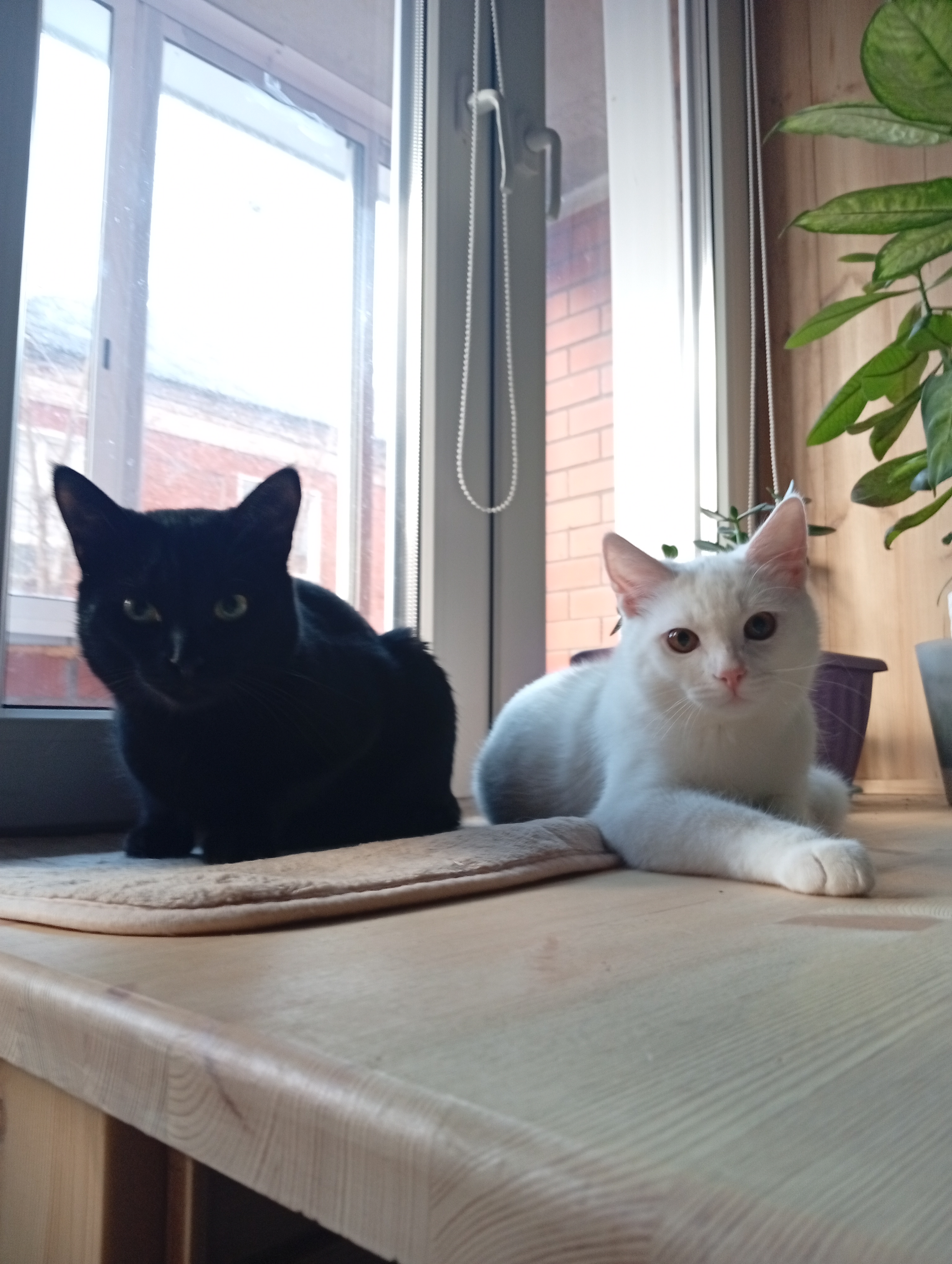 Фото питомца: коты Тимофей и Умка лежат на столе