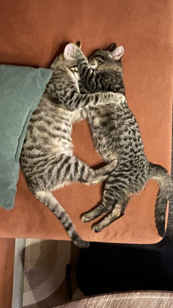 Сейчас и Тоша и Тимоша два толстяка с лучшей жизнью: им выпал джек-пот: растут в абсолютной любви, безопасности, сытости. Гоняются друг за другом и шуршащими шариками, намывают друг друга, спят — и так проходит весь их день. Особенно расцвел Тимоша: из "кота на сдачу" — маленького, худого, немного косоглазого и пугливого стал лоснящимся упитанным домашним котом. Неизвестно, как бы сложилась их жизнь, если бы мы их не забрали, но я счастлив, что они с нами.