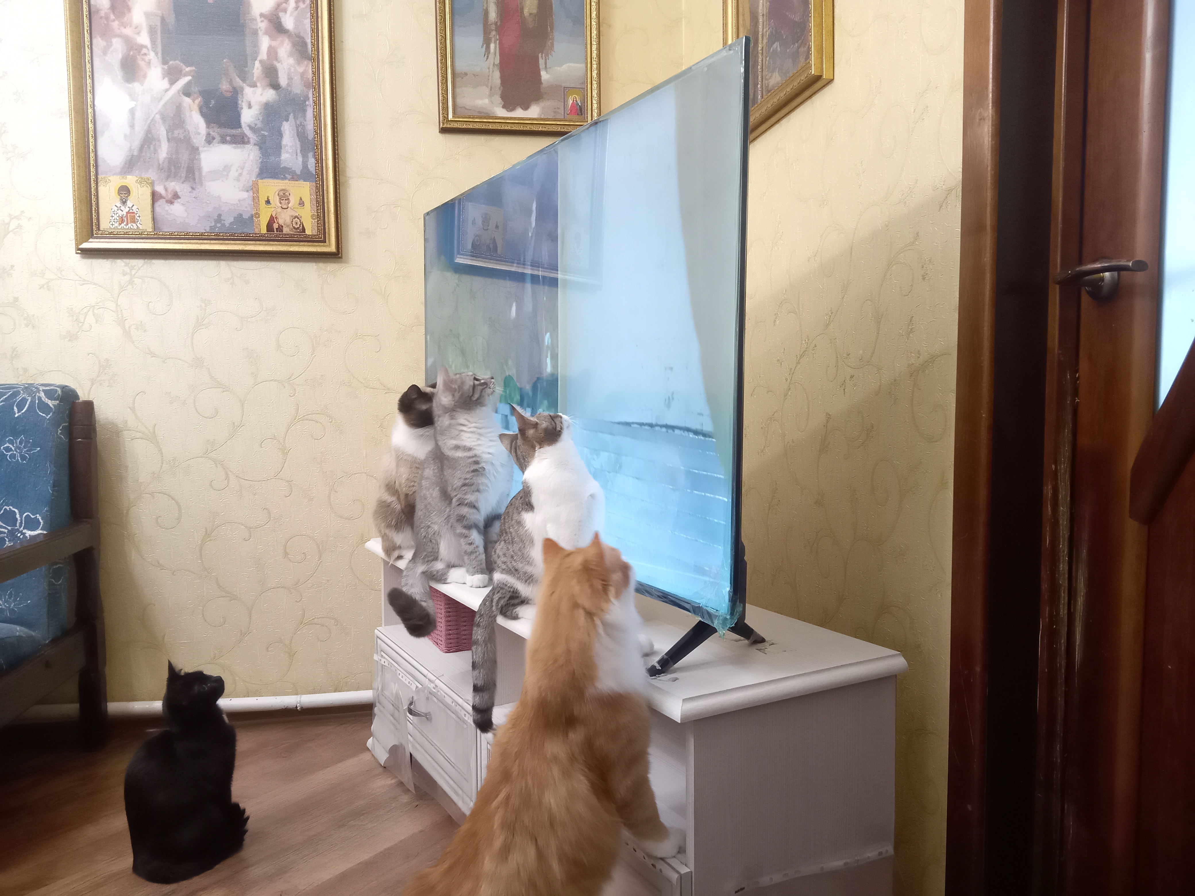 Фото питомцев: кошки увлеченно смотрят телевизор