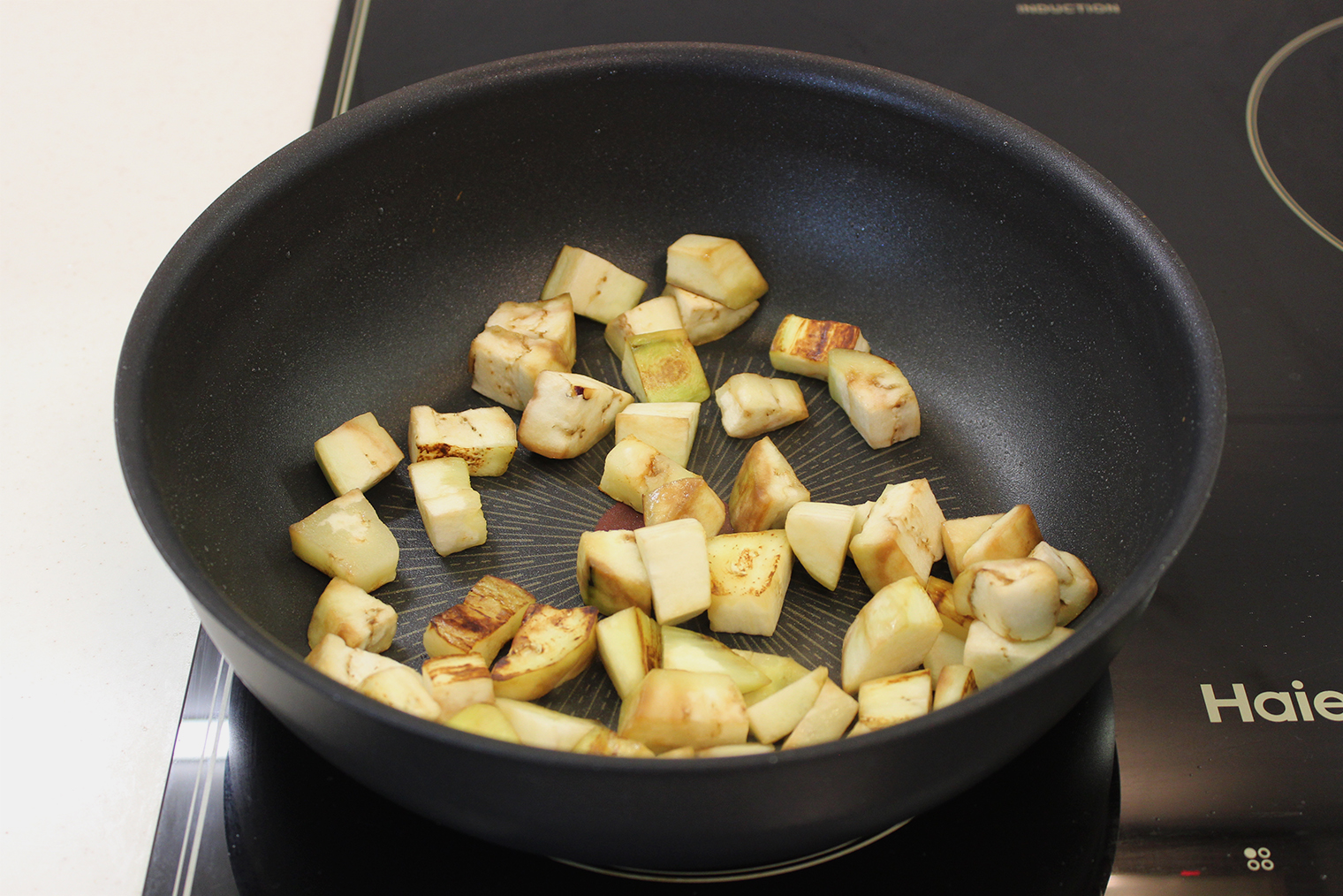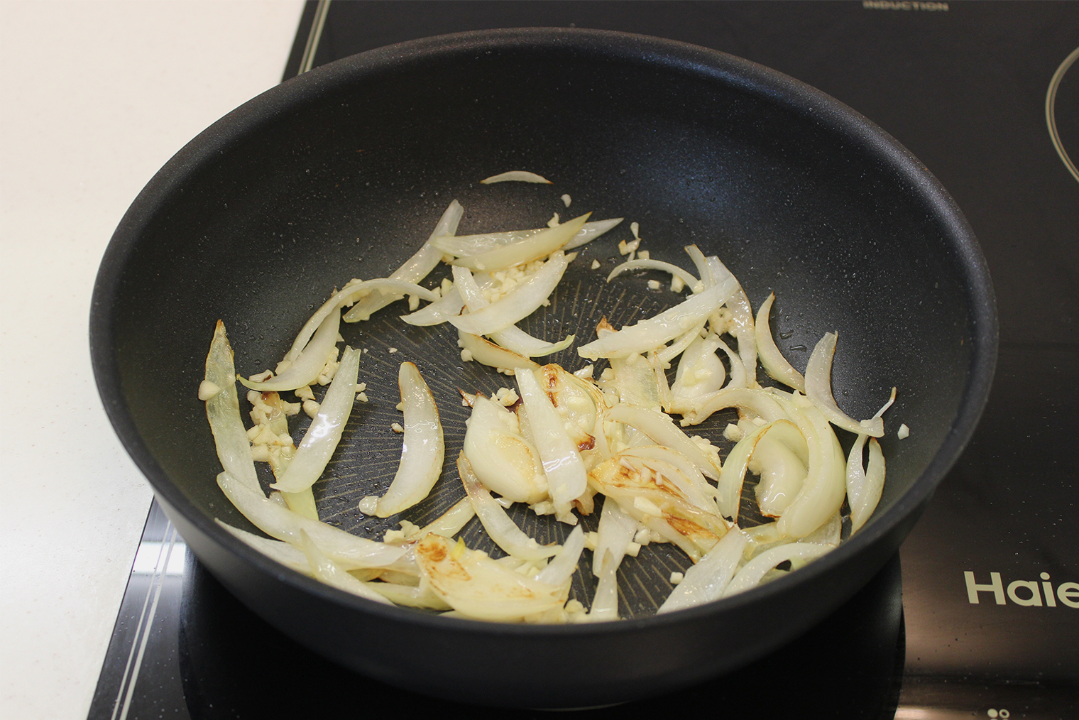 Все ингредиенты для блюда по очереди обжаривают и запекают.