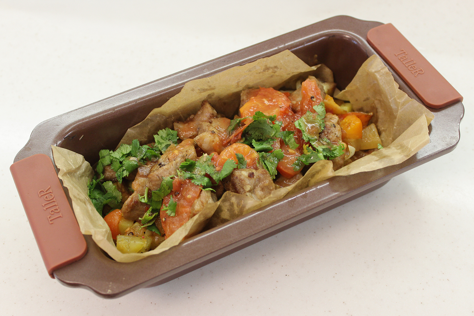 Традиционно чанахи готовят в горшочках, но я покажу, как обойтись без них. Мясо можно взять любое, главное — выбрать мягкий и сочный отруб, например куриные бедра, говяжий толстый или тонкий край, бараний окорок. Я взяла свиную шею.