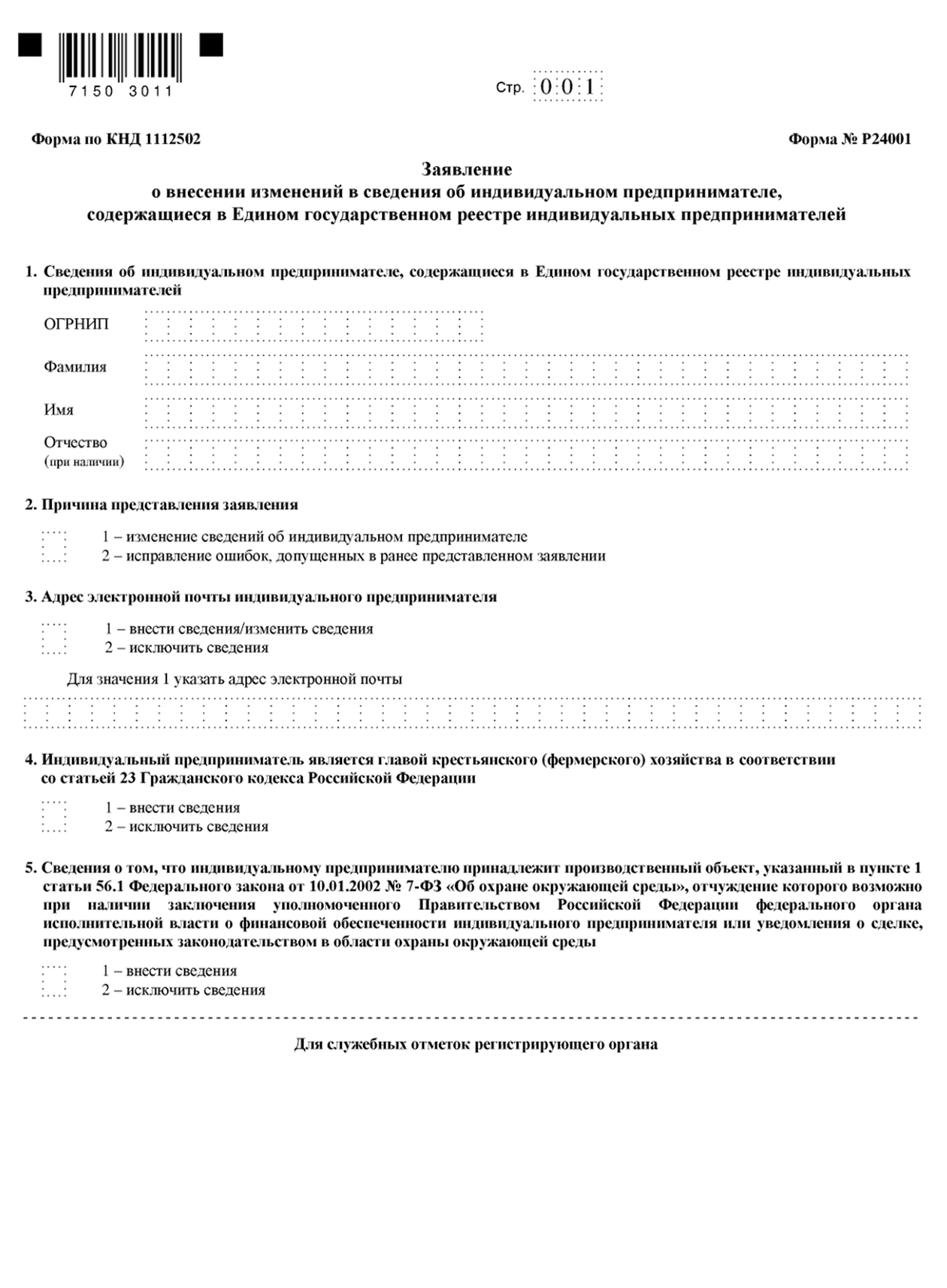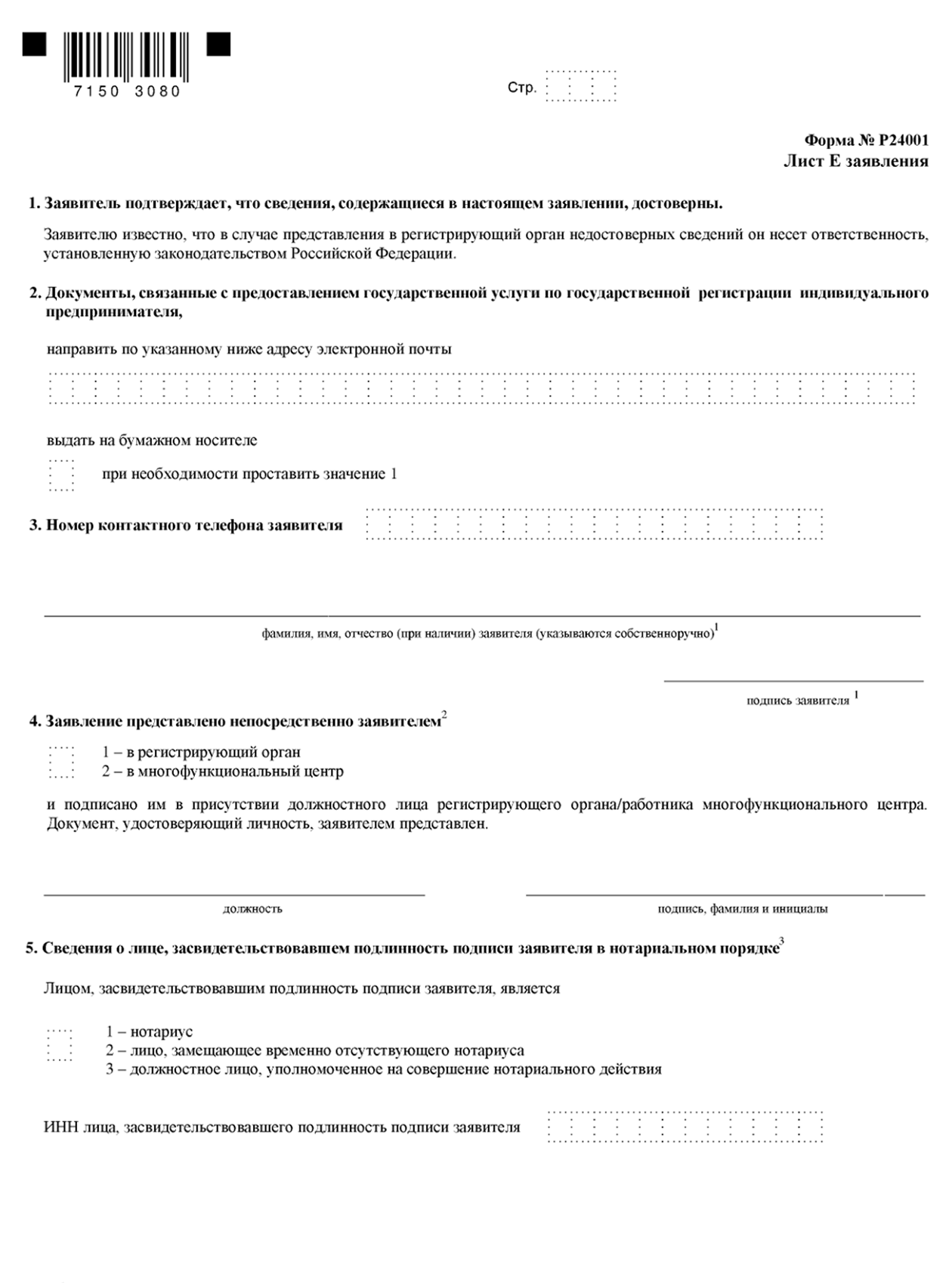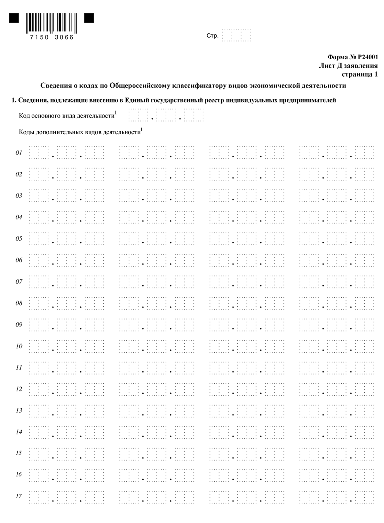 Для корректировки кодов ОКВЭД предприниматель заполняет и подает в налоговую заявление по форме Р24001, в котором заполняет страницу 1, листы Д и Е.