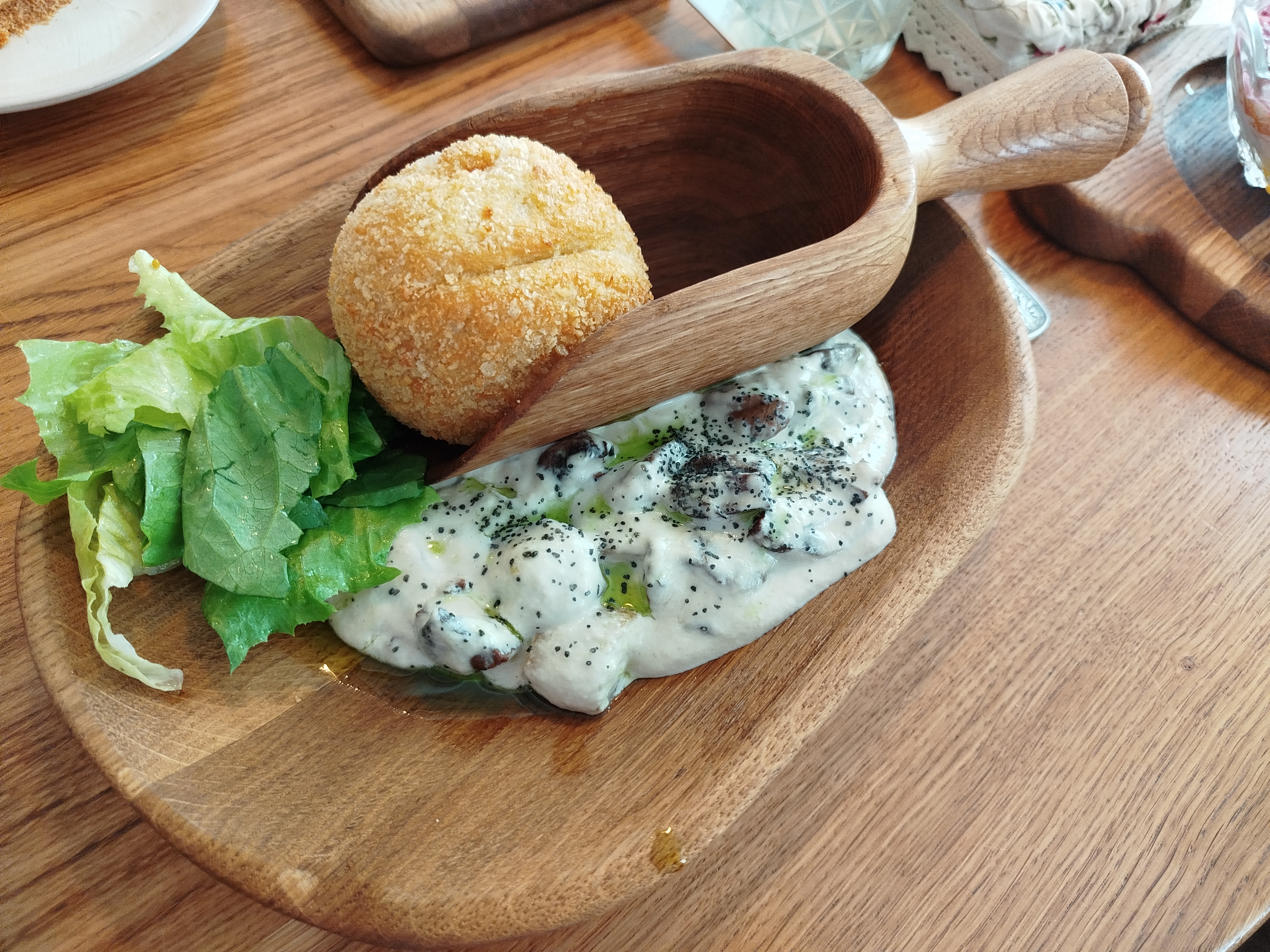Зато во второй день я отобедала в очень классном месте — ресторане славянской кухни «Корчма Гопак». Я про него читала в статьях об Ульяновске на Т–Ж, и также мне его посоветовала экскурсовод, которая проводила обзорную экскурсию. Там оказалось очень приятно и атмосферно, и в меню есть целый раздел для туристов — например, можно попробовать любимую яичницу Ульяновых. Я выбрала соленые грибы под шубой и картофельный колобок — внутри него копченый гусь, а подается блюдо на деревянной лопате с грибным соусом. Также в этот день был день рождения ресторана, и на десерт мне бесплатно дали медовик. Обед стоил 1660 ₽, и в отличие от обеда в грузинском ресторане накануне, мне показалось, что обед стоил своих денег.