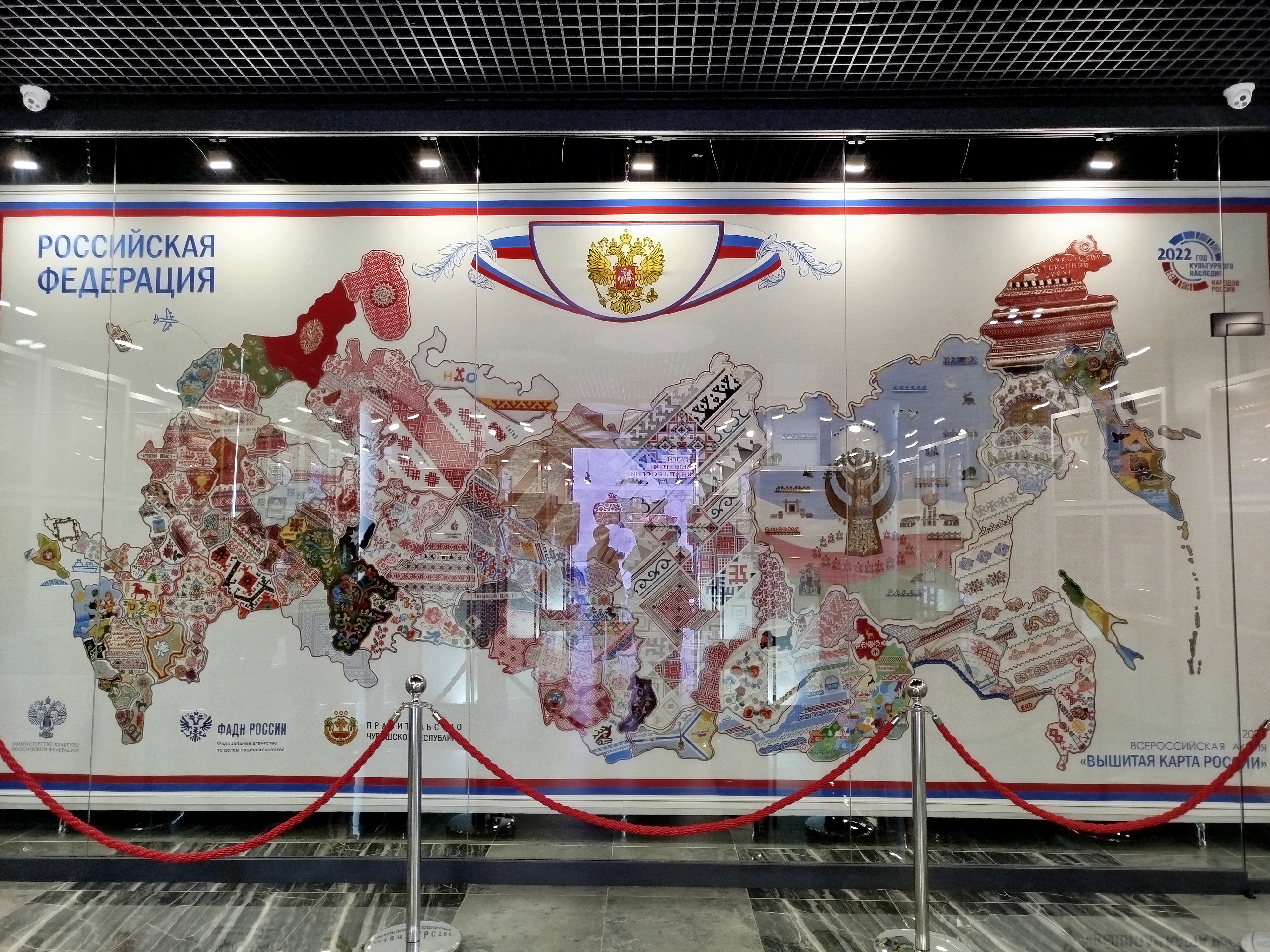 Сначала я посетила Музей вышитой карты России, и пожалуй, он мне понравился больше всех остальных музеев. Он начинался как выставка. Каждый регион России должен был представить образец своей традиционной вышивки, и из фрагментов этих вышивок составили карту России. Эта карта была представлена на выставке «Россия» на ВДНХ в Москве, потом ее вернули в Чебоксары, и какое-то время она размещалась в Чувашском национальном музее, а в этом году для нее построили отдельное здание. Главный экспонат музея — собственно, вышитая карта России, но также в экспозиции представлены образцы вышивки разных регионов нашей страны, они находятся по периметру зала. Входной билет в музей стоит 300 ₽.