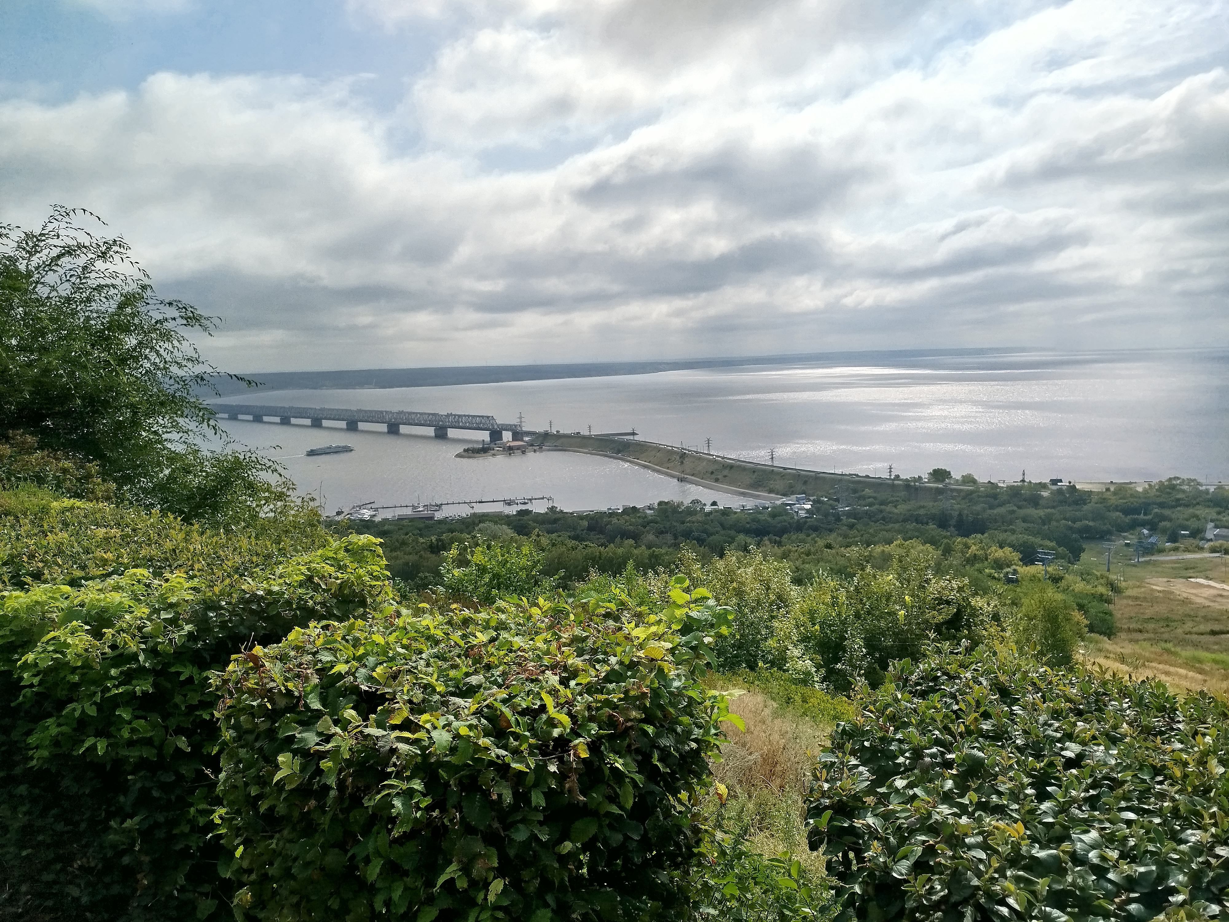 Однако оказалось, что набережной в привычном понимании в Ульяновске нет. То, что на карте обозначено как набережная реки Волги, — это довольно плохая дорога с деревьями и кустами с обеих сторон и линией электропередач. Воды с этой «набережной» вообще не видно. Людей опять же нет. Иногда проезжают машины. Я дошла до Центрального пляжа. И он тоже был абсолютно пустынным. Кафе, магазинчики стояли закрытыми, на вышке сидели спасатели, а по берегу ходили единичные люди. Также на территории пляжа находятся бассейны с темной водой, и честно говоря, они выглядят весьма мрачно. Я немного прогулялась по пляжу, полюбовалась видом на Куйбышевское водохранилище, на Императорский мост и решила, что надо каким-то образом подниматься обратно в ту часть города, где находится гостиница.