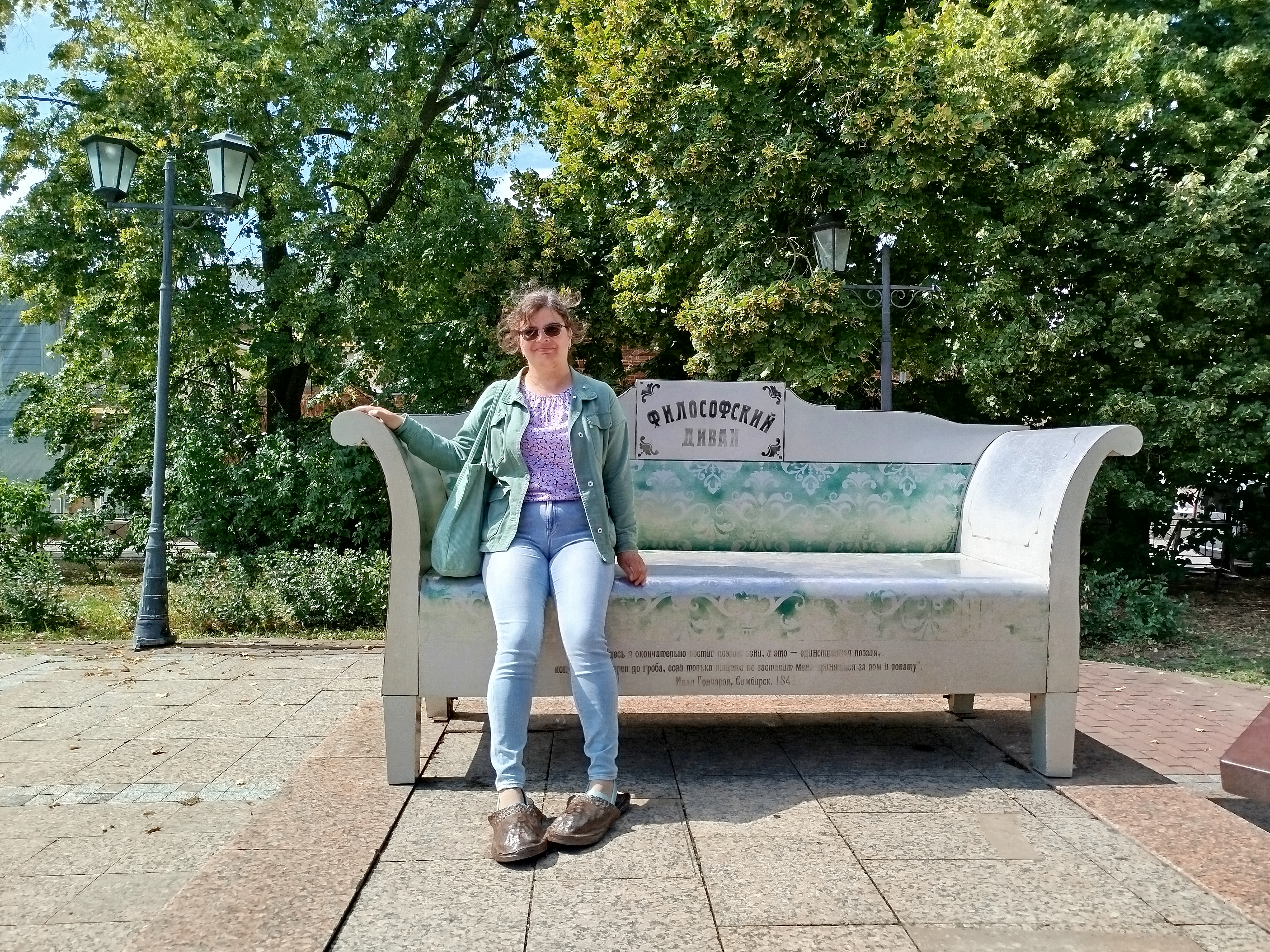 Далее я посетила Дом-музей И.А. Гончарова с индивидуальной экскурсией. Так совпало, что совсем недавно я в рамках книжного челленджа прочитала «Обломова», поэтому мне было особенно интересно посмотреть на обстановку, в которой вырос писатель и про которую, очевидно, писал в романе. Дом-музей И.А. Гончарова очень большой, он был перестроен следующими хозяевами, и потому включает несколько экспозиций — собственно интерьеры дома Гончарова; экспозиция, посвященная жизни и творчеству писателя (после рассказа о его жизни я окончательно утвердилась в мысли, что мне необходимо прочесть книгу «Фрегат Паллада»), старинны часы с колокольни Спасо-Вознесенского собора, находящиеся теперь на верхнем этаже дома Гончарова, а также подвал. Экскурсия стоила 900 ₽. Наискосок от музея находится памятник И.А. Гончарову, а рядом с ним стоит диван Обломова, на котором можно сфотографироваться.