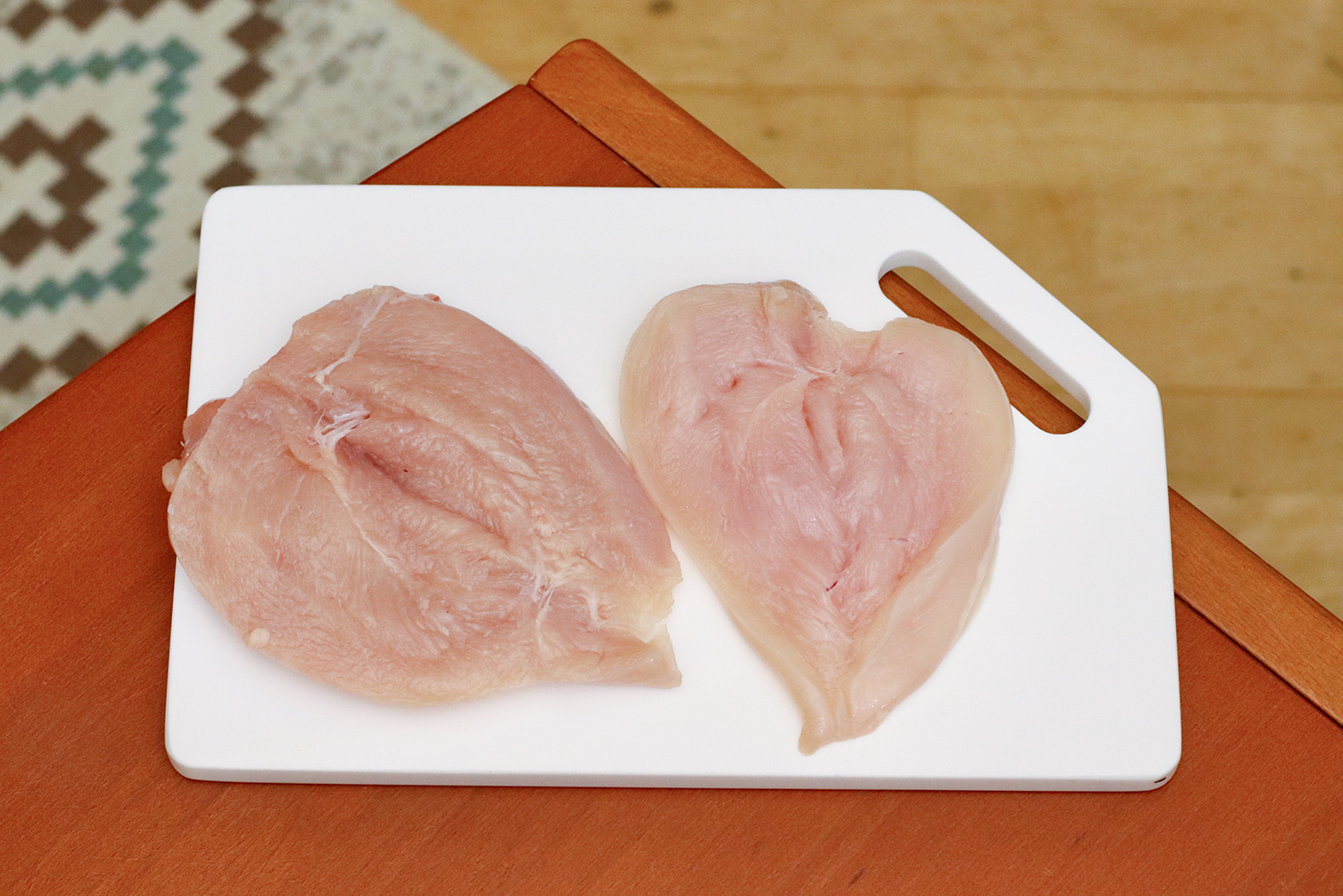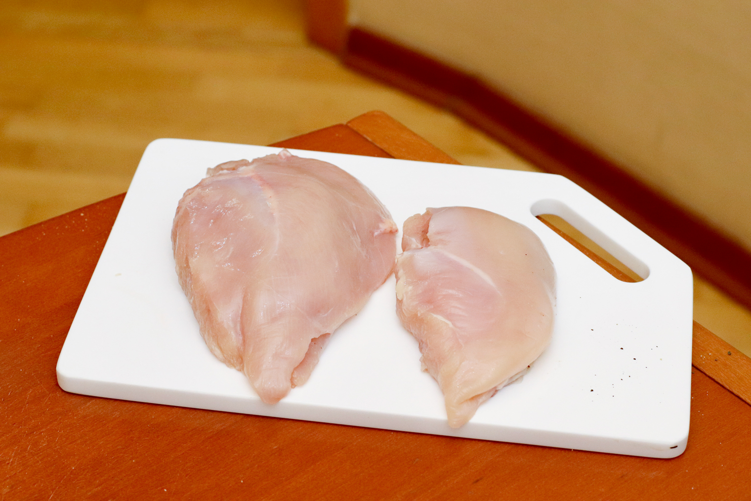 Шаг 2. Куриные грудки разрежьте вдоль, но не до конца. Получившиеся конвертики раскройте, как книгу.