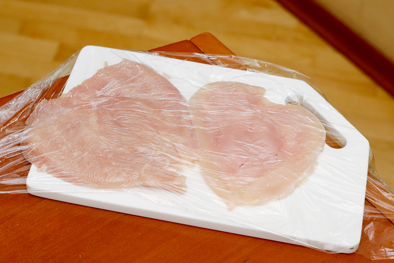 Шаг 3. Курицу накройте пищевой пленкой и слегка отбейте скалкой или молотком для мяса.