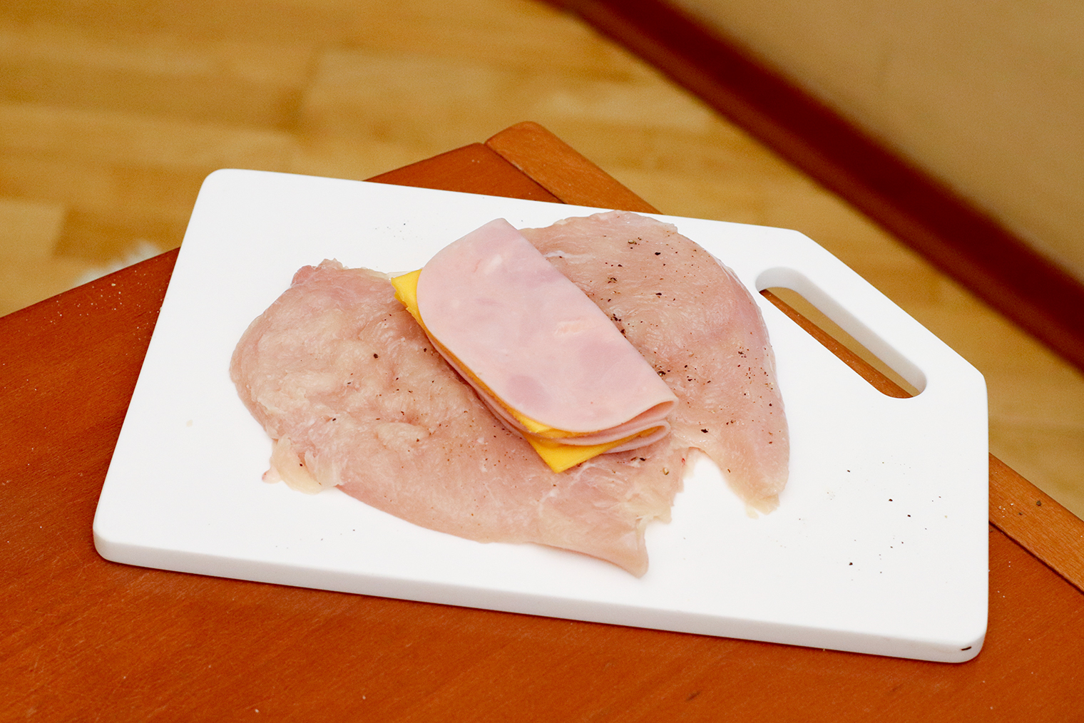 Шаг 4. Курицу посолите и поперчите. В середину каждого куска выложите по два слайса сыра и ветчины.