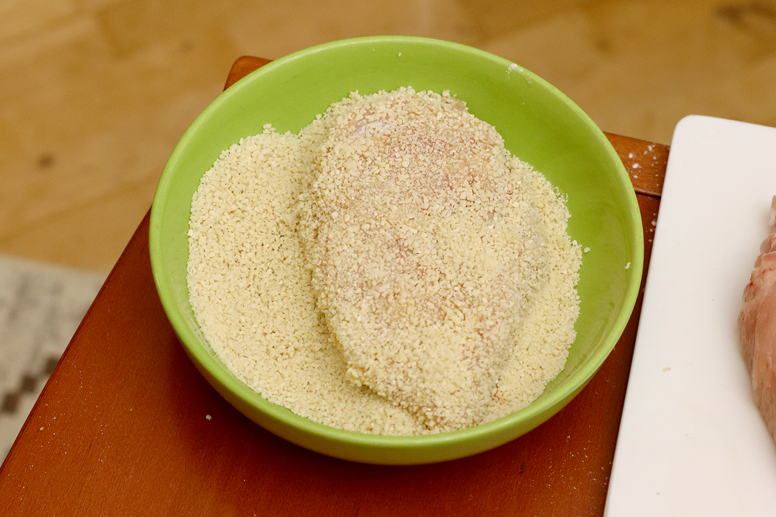 Сперва его обваливают в муке, потом в яйце и, наконец, в сухарях — так корочка получается идеально хрустящей. Сухари можно купить или приготовить. Для этого белый хлеб подсушивайте в духовке 10—15 минут при 180 °C. Затем остудите и измельчите в блендере.