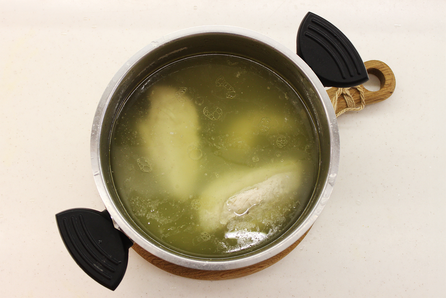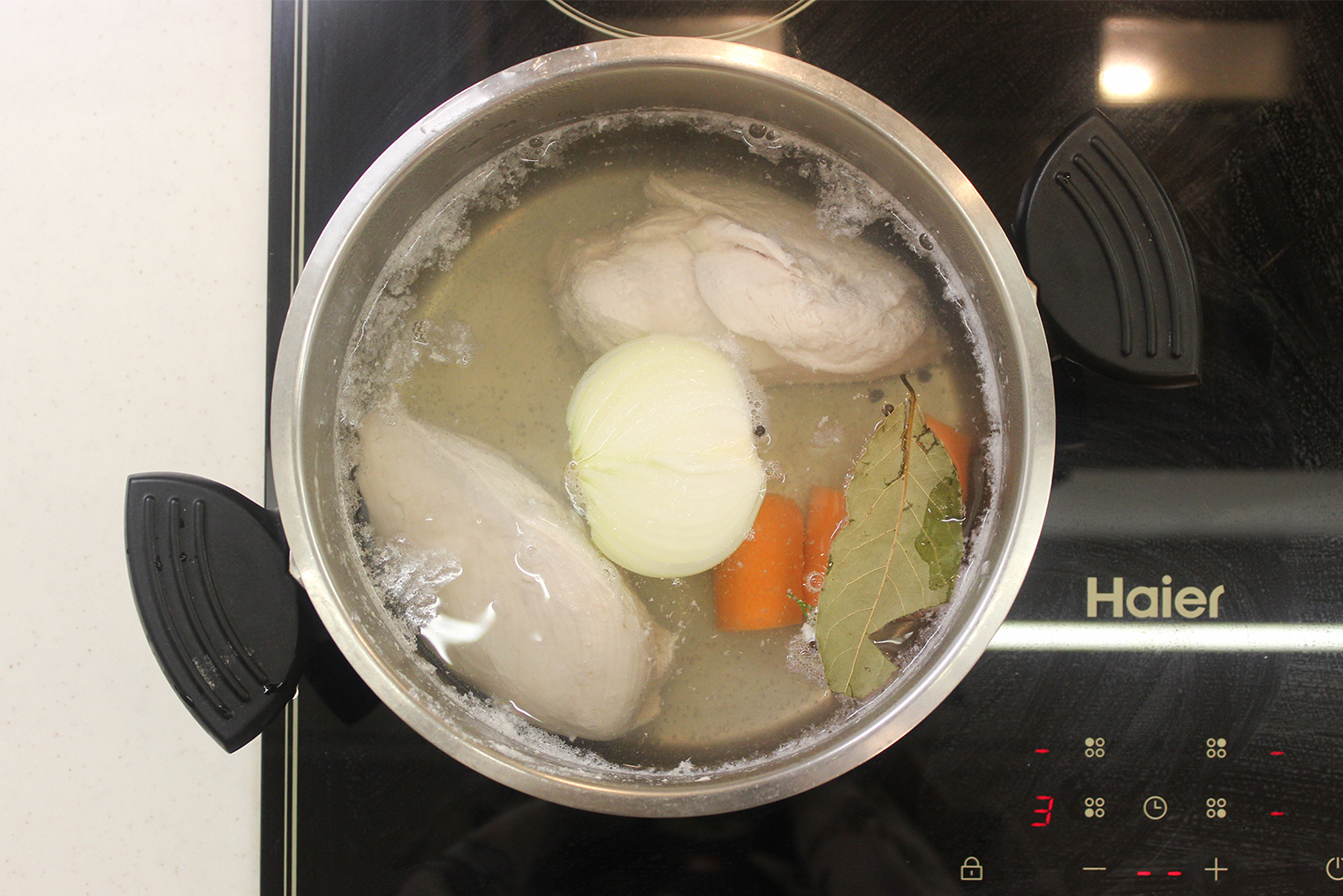 Шаг 1. Курицу положите в кастрюлю и залейте холодной водой так, чтобы она полностью покрывала грудки. Доведите до кипения на среднем огне и снимите пену.