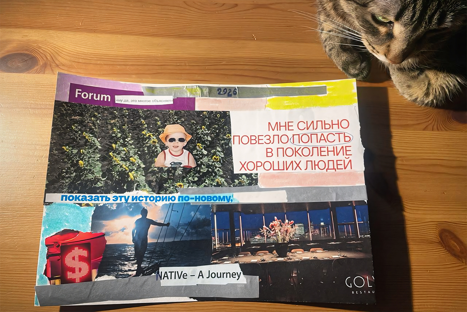 Это мой второй коллаж во взрослой жизни, со времен далекого детства. Понравился вайб и вспомнилась консистенция клея ПВА. Музыка на фоне, комфортный дамский кружок. Добро, тепло, любовь.